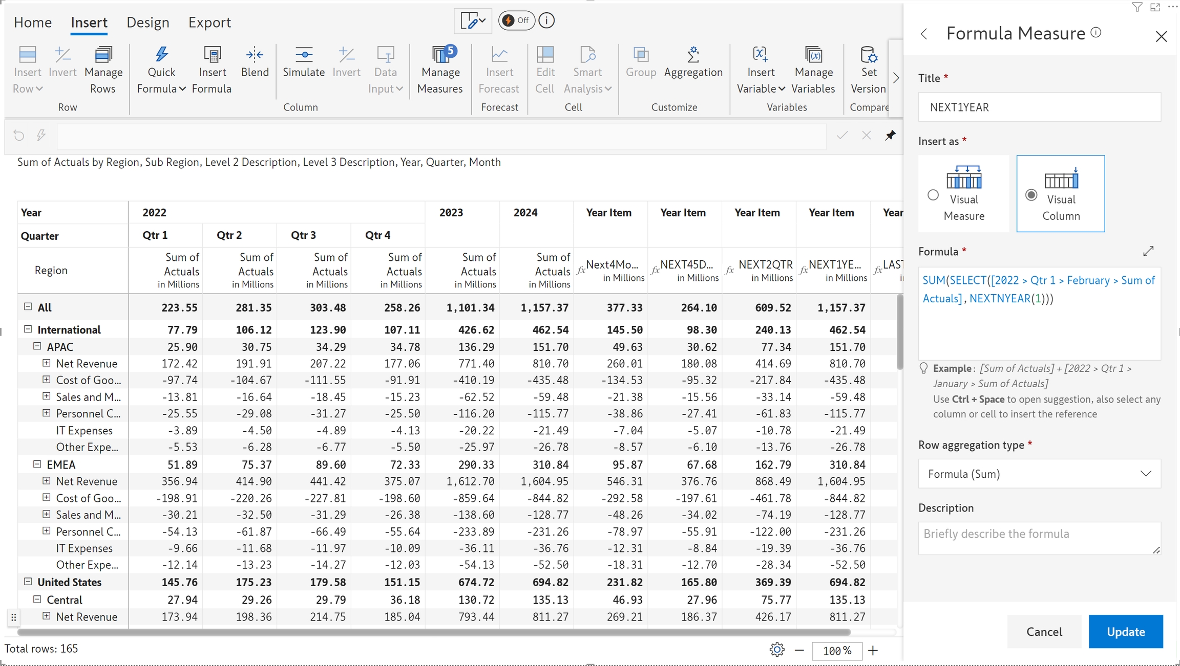 The NEXTNYEAR function can be used to select data from a given measure, for a specified number of years after the current year. It should be used in conjunction with the SELECT clause and an aggregate function like SUM or AVERAGE.