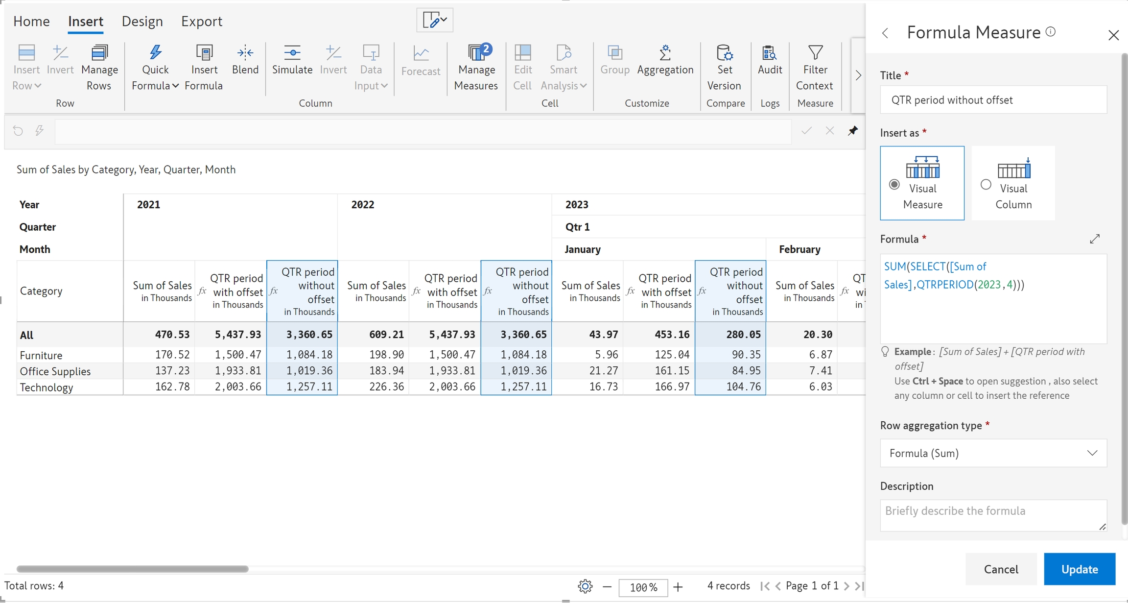The QTRPERIOD function can be used to select data from a given measure, for a particular quarter or a range of quarters. It should be used in conjunction with the SELECT clause and with an aggregate function like SUM or AVERAGE.
