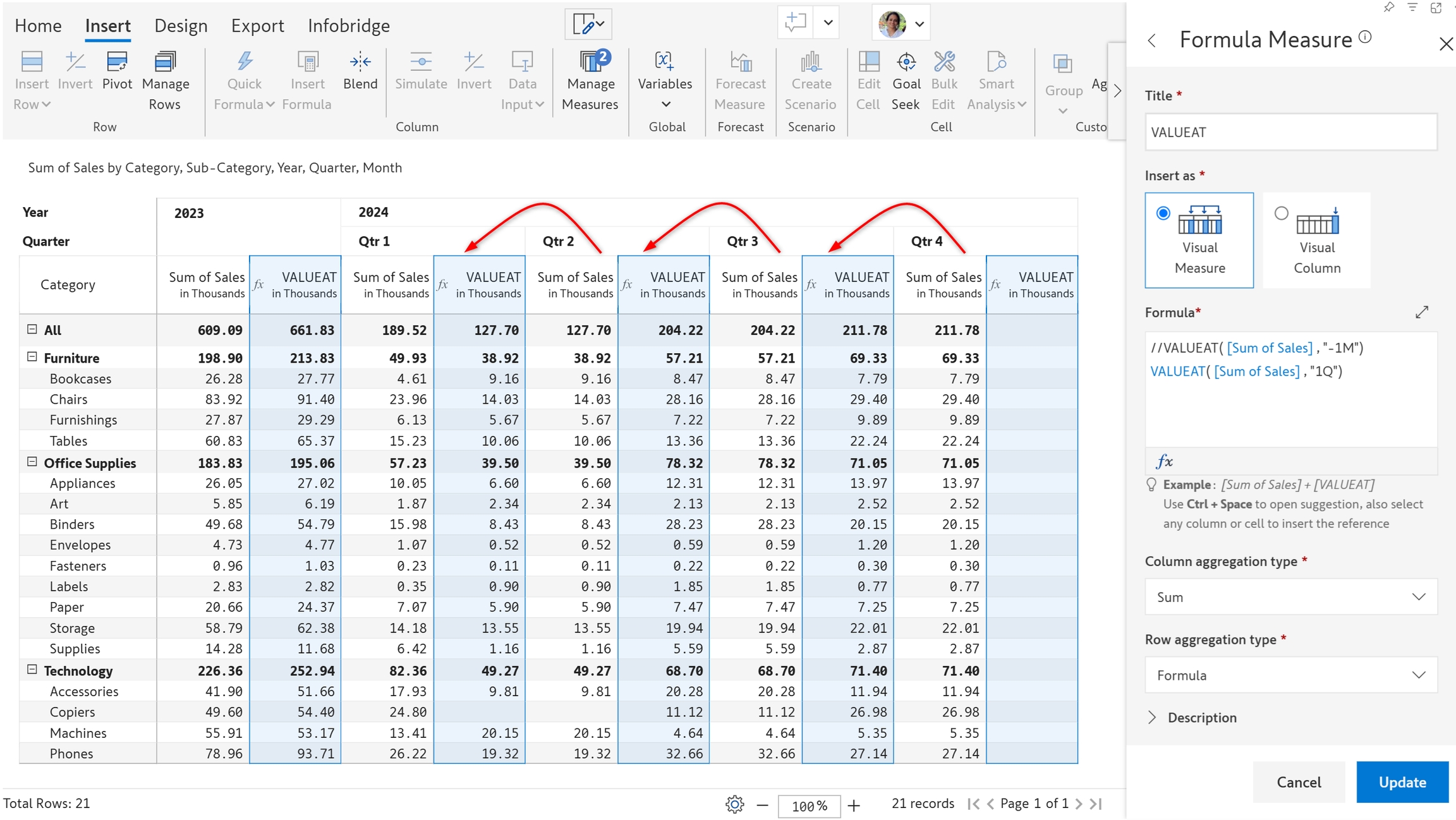 //Returns the sales measure from the next quarterLet's look at a monthly sales report. The VALUEAT function can be applied to return the value of the sales measure for a particular month(s) preceding or after the current month. This is useful in evaluating the financial performance relative to other periods.
