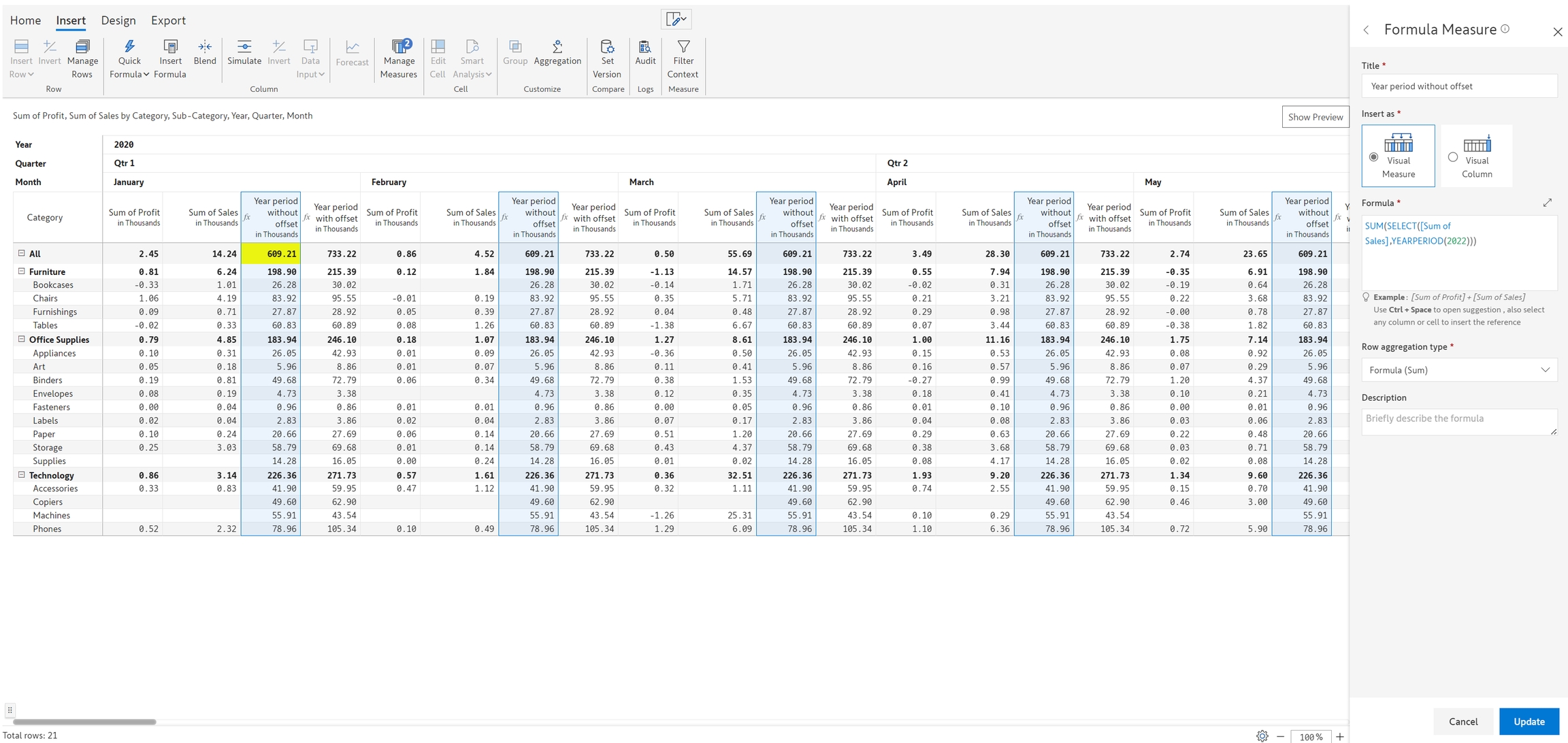 The YEARPERIOD function can be used to select data from a given measure, for a particular year or a range of years. It should be used in conjunction with the SELECT clause and with an aggregate function like SUM or AVERAGE.
