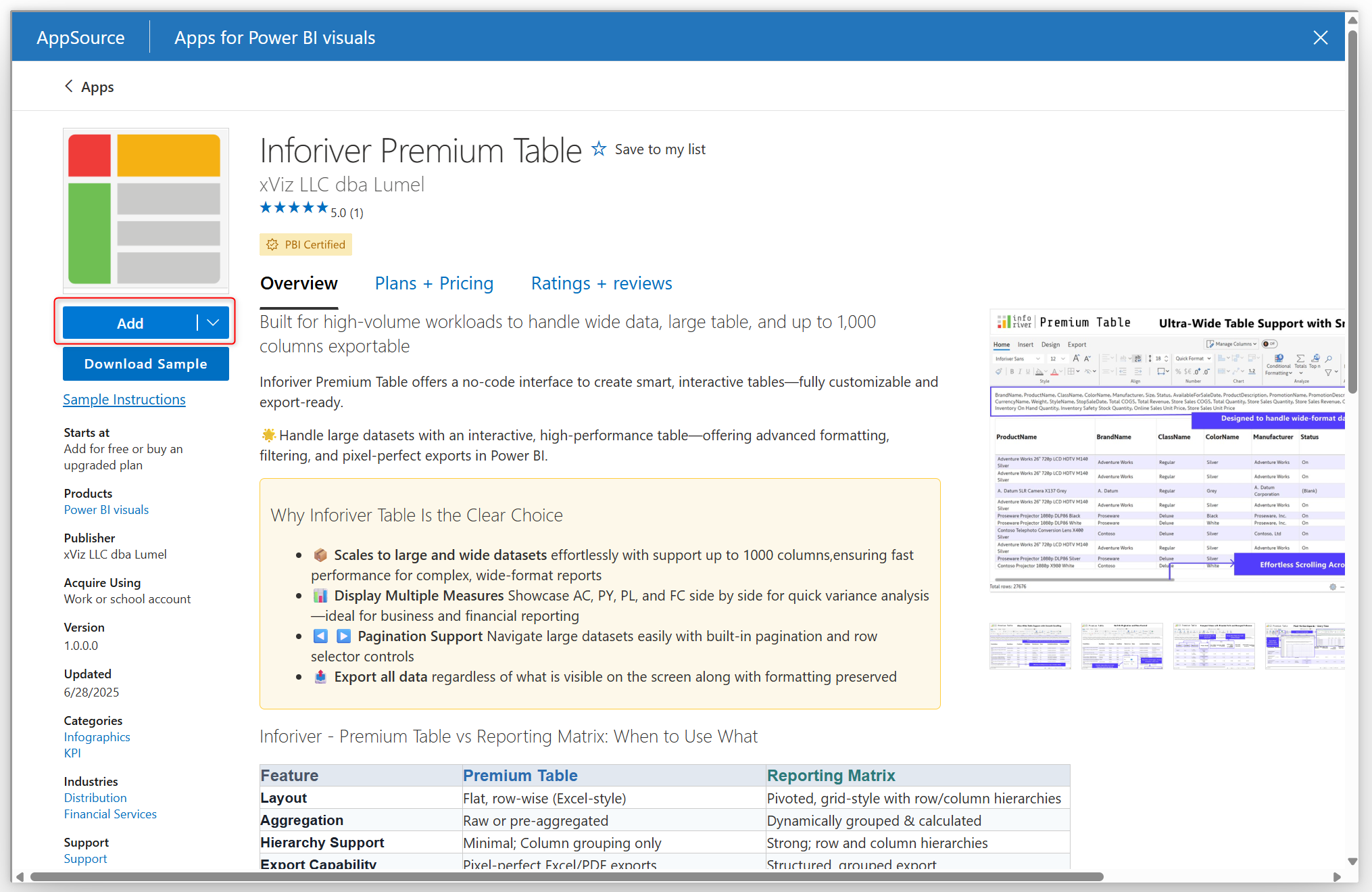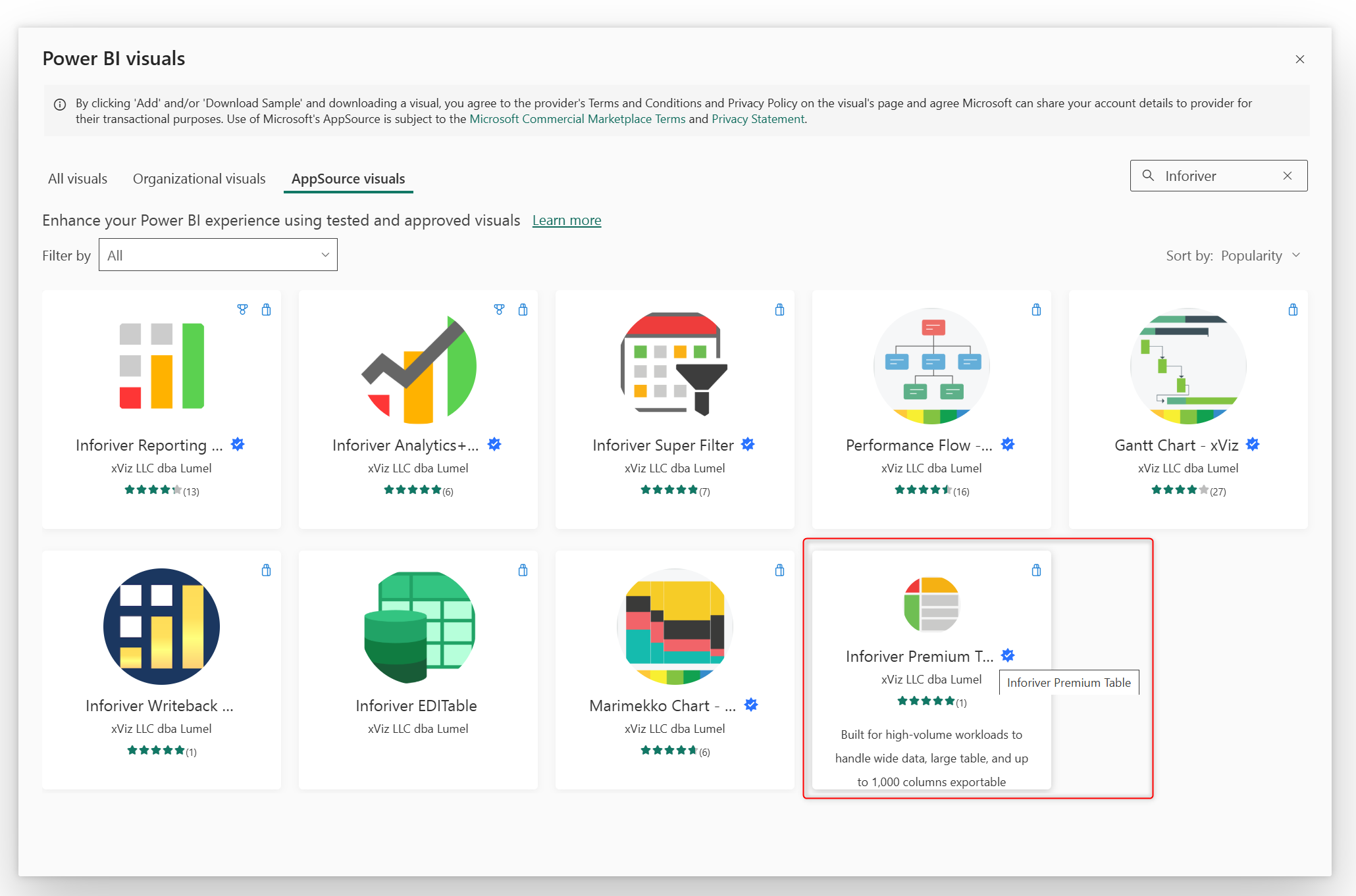 2. Navigate to the **AppSource visuals** tab and type 'Inforiver' in the search box. Select **Inforiver Premium Table**.