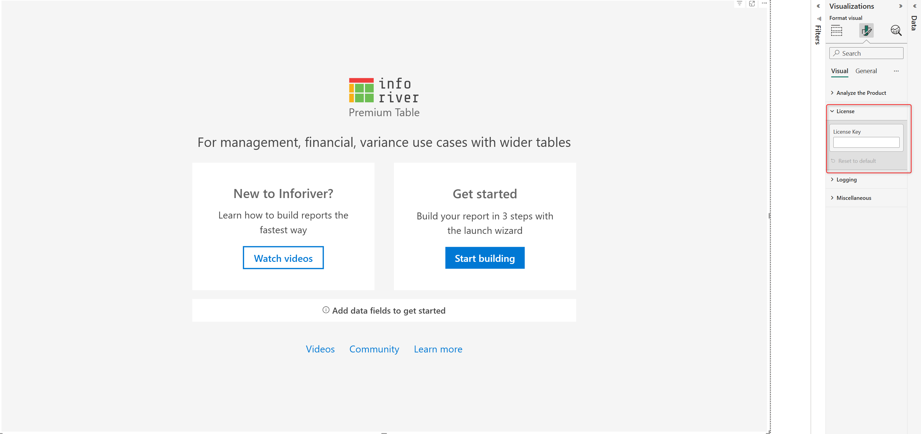 5. Click on the Inforiver icon to add the visual to the canvas. Click on 'Format your visual' and enter the license key in the highlighted field.