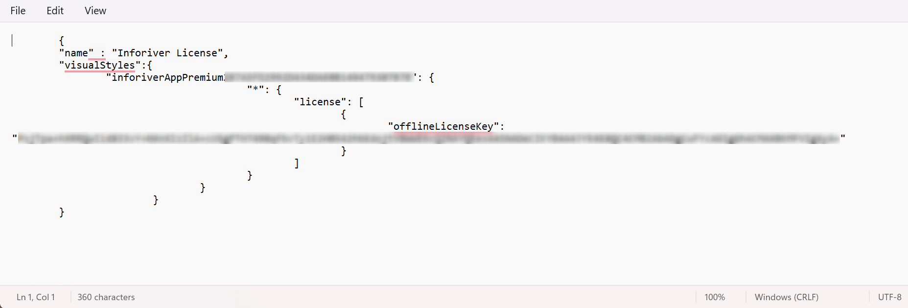 STEP 2: Open the saved Power BI JSON theme file. Append the contents of the license key shared by the Inforiver team to the theme file.