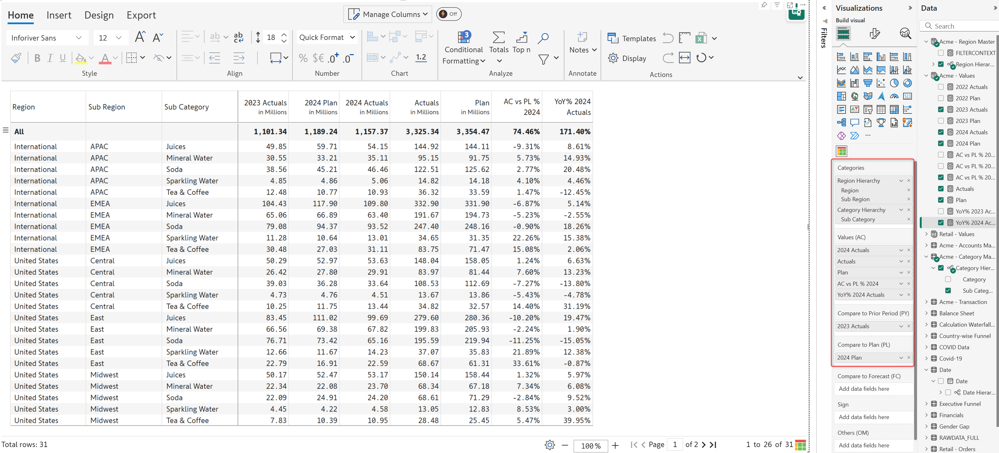 If you have experience with Power BI, this process is identical to any other Power BI visual. We've assigned the row dimensions to the Categories bucket and the measures to the AC/PY/PL buckets.