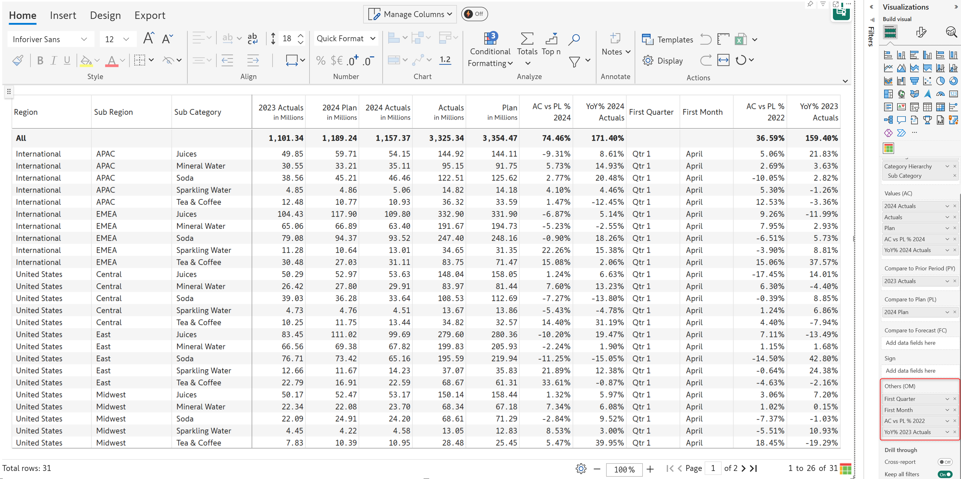 Apart from AC/PY/PL/FC, Inforiver will allow you to add any number of additional measures/dimensions in the Others(OM) parameter.&#x20;