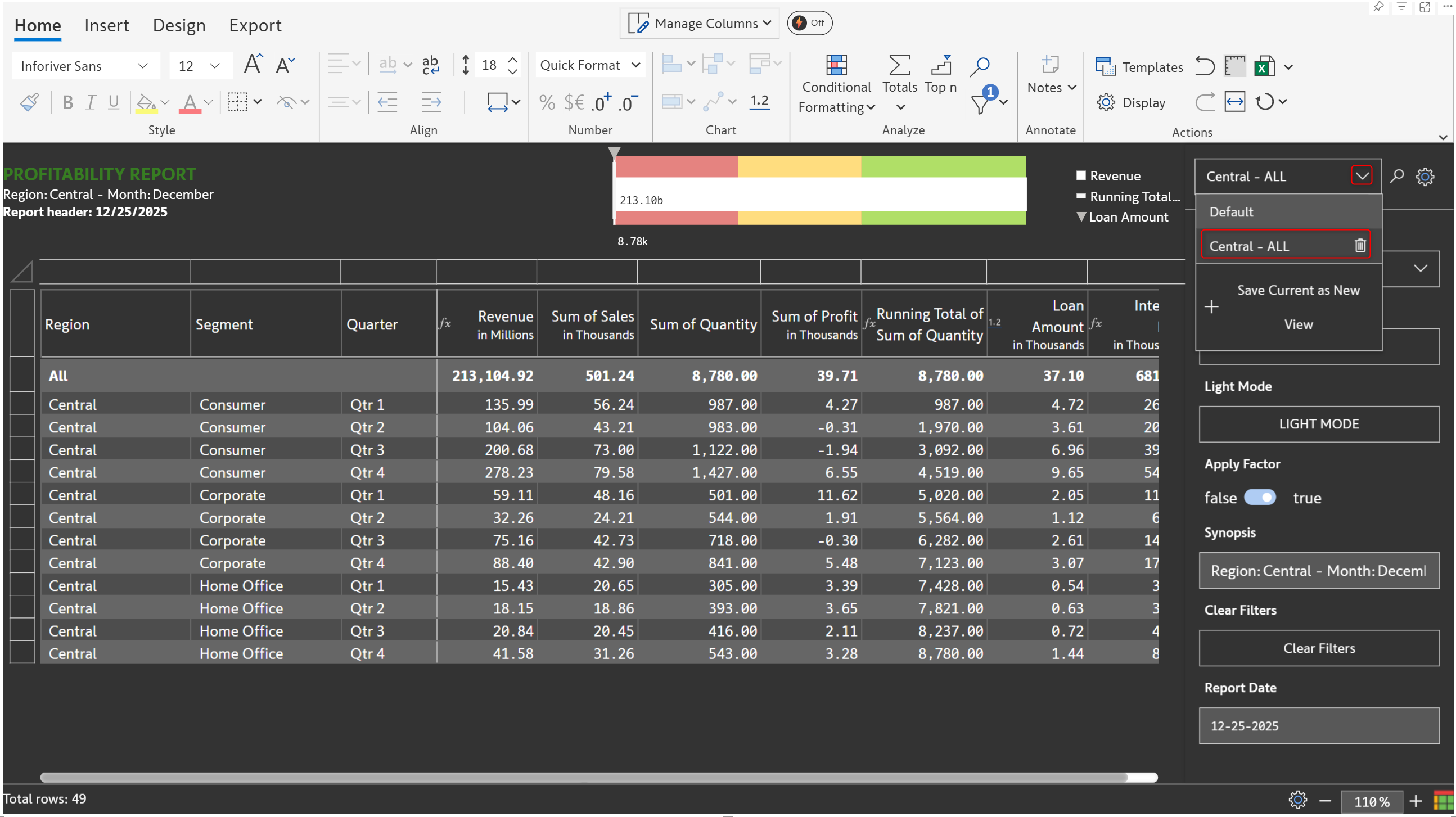 You can save the options chosen/set for the variables in a report and assign a name - similar to a bookmark. This feature enables you to switch between different configurations without having to setup each variable repeatedly.