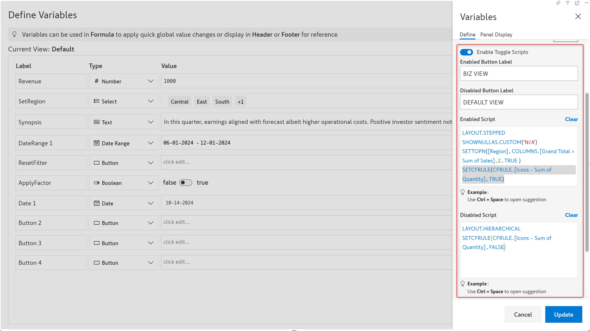 You can use the button variable to trigger a set of actions such as setting the layout, ranking the data, or displaying data for a specific period.