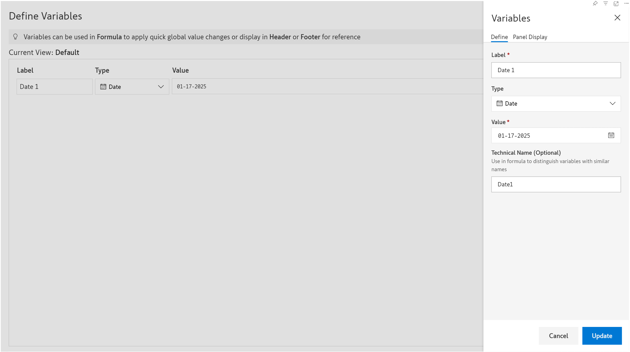 **STEP 3:** Users can instantly set a date in the report header by just selecting it from the variable. The header does not have to be edited each time.