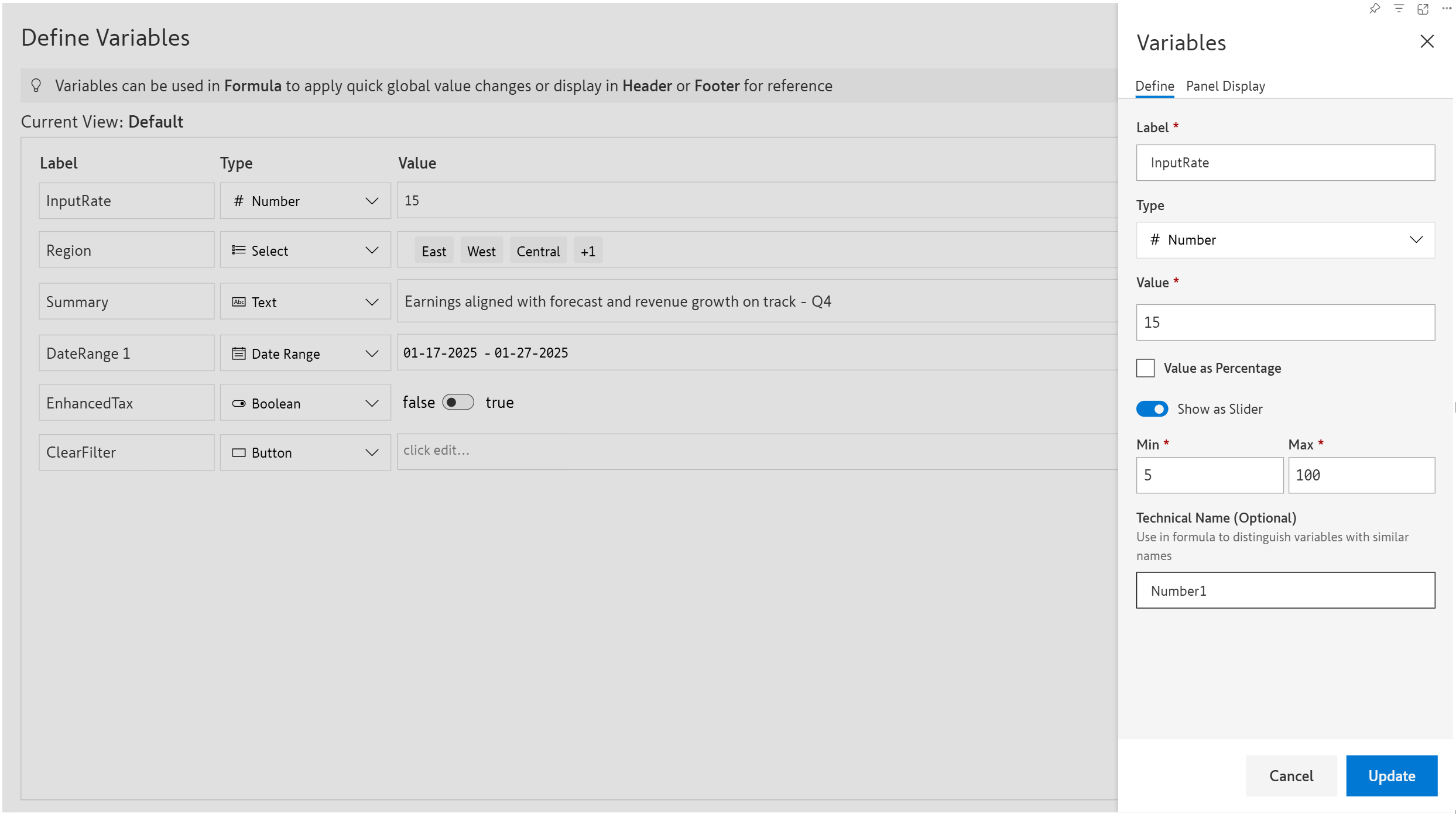 <figure><img src="https://2428652681-files.gitbook.io/~/files/v0/b/gitbook-x-prod.appspot.com/o/spaces%2FsB9HAei8v4FfKkH9M4gw%2Fuploads%2FjyCJdbDKyQ6EY6XPIEdj%2FUntitled%20Project.gif?alt=media&#x26;token=5c553922-095a-40a9-93c4-26d7a9c4fdf3" alt=""><figcaption><p>Calculated measure changes based on the variable value</p></figcaption></figure>