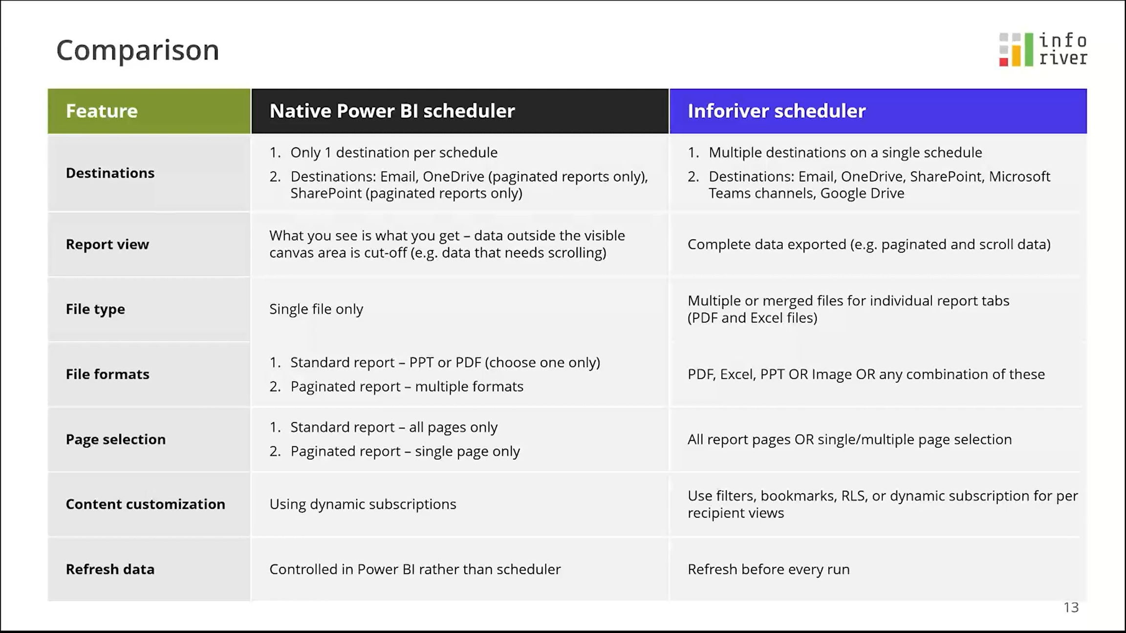 The Inforiver scheduler offers several advantages over the native Power BI scheduler. You can find below the comparison between them: