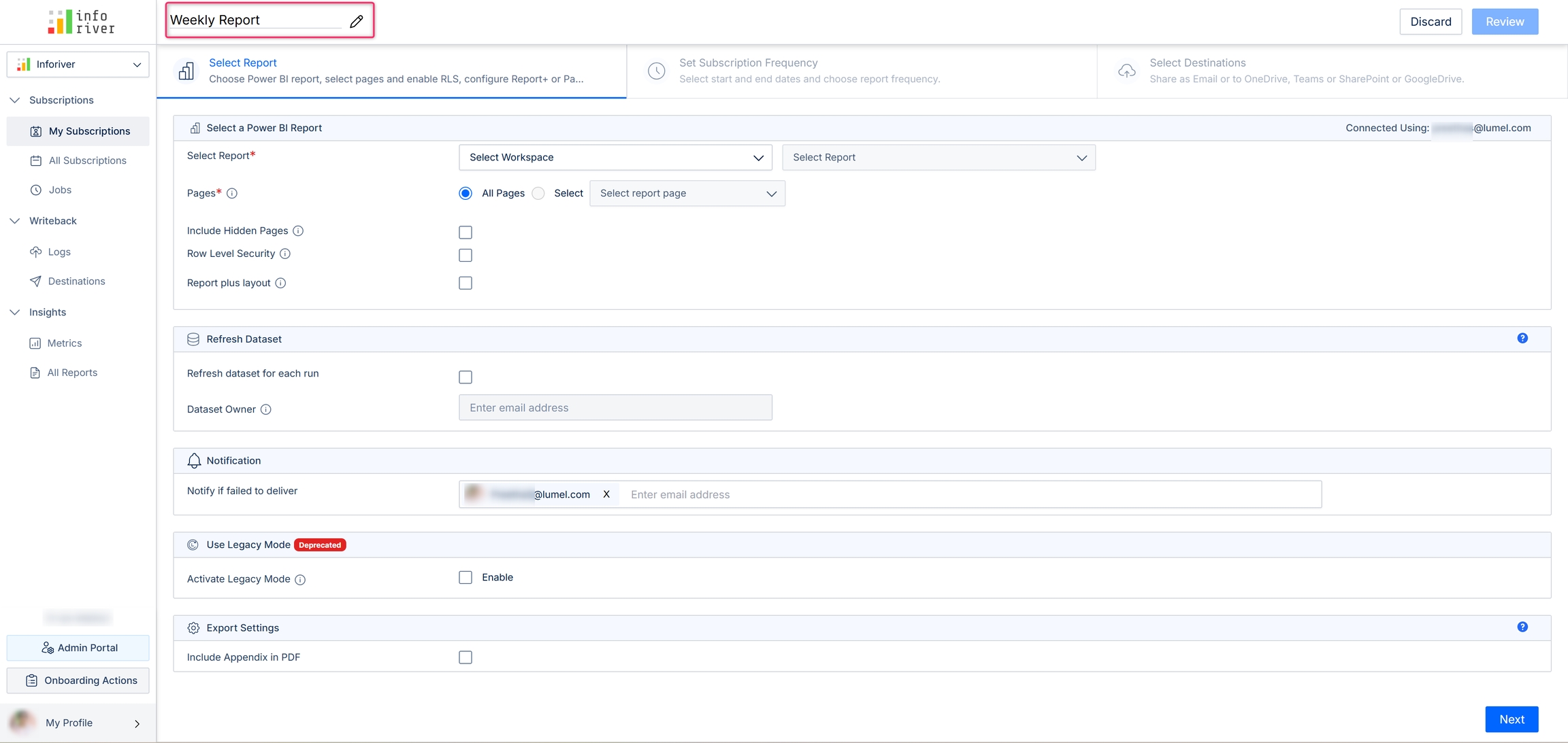 Starting a new subscription (standard or dynamic) takes you to the 'New subscription' page of the Inforiver Scheduler application. It has 3 tabs: 'Select Report', 'Set Subscription Frequency', and 'Select Destinations' where you can configure all your subscription settings.