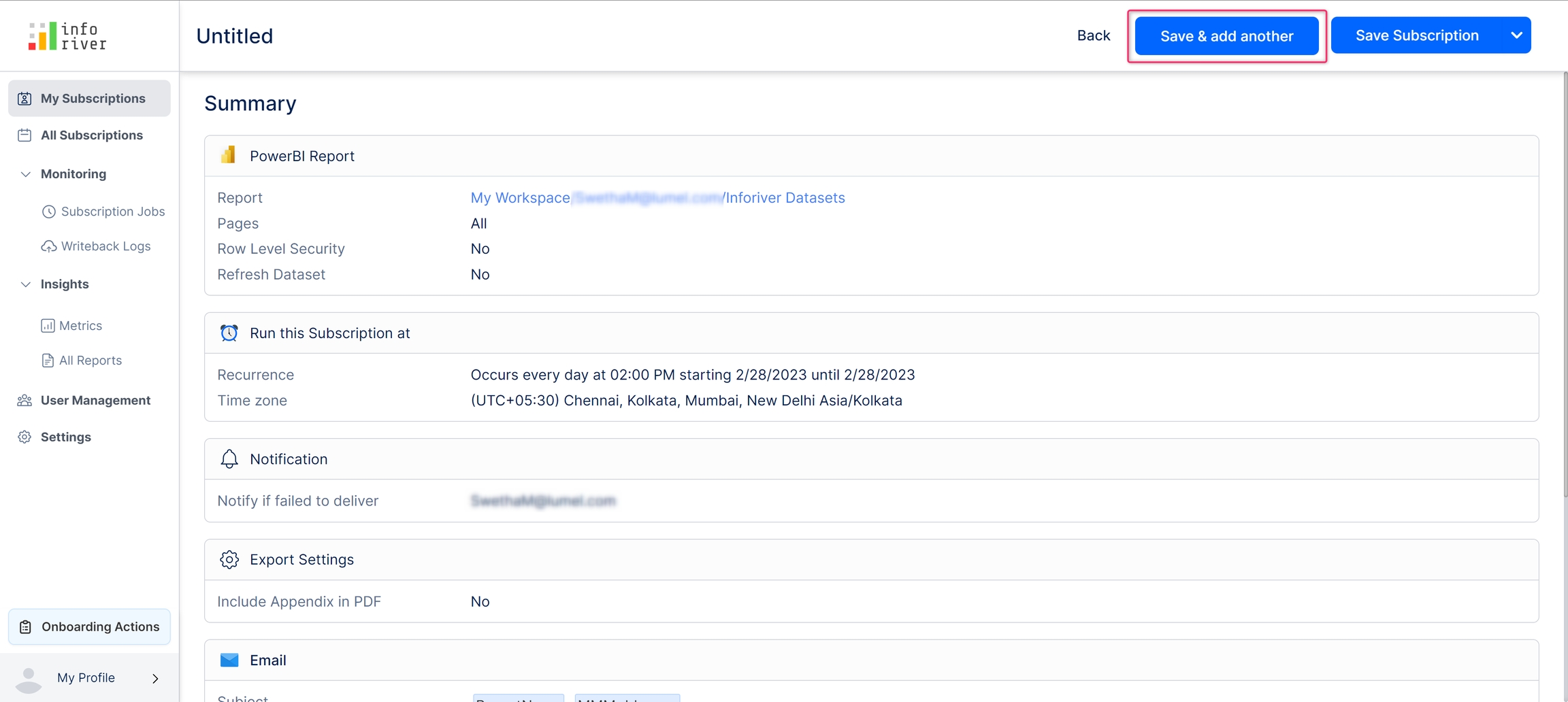 But clicking on 'Save and add another' will create a subscription and open the 'New subscription' screen again with all the previously entered 'Select report' options retained.
