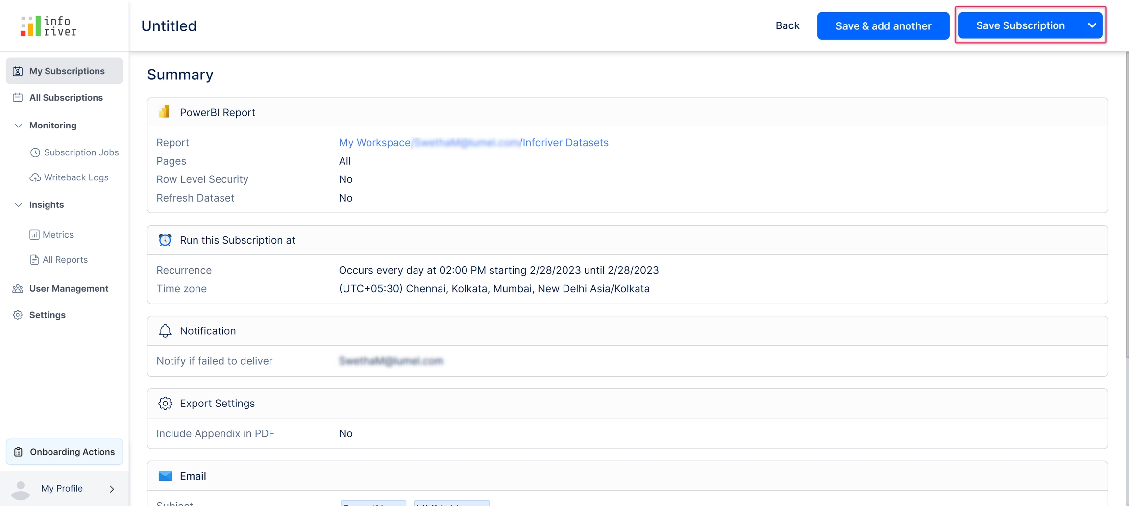 After reviewing the configurations you can complete the subscription creation process by clicking on the 'Save subscription' option.
