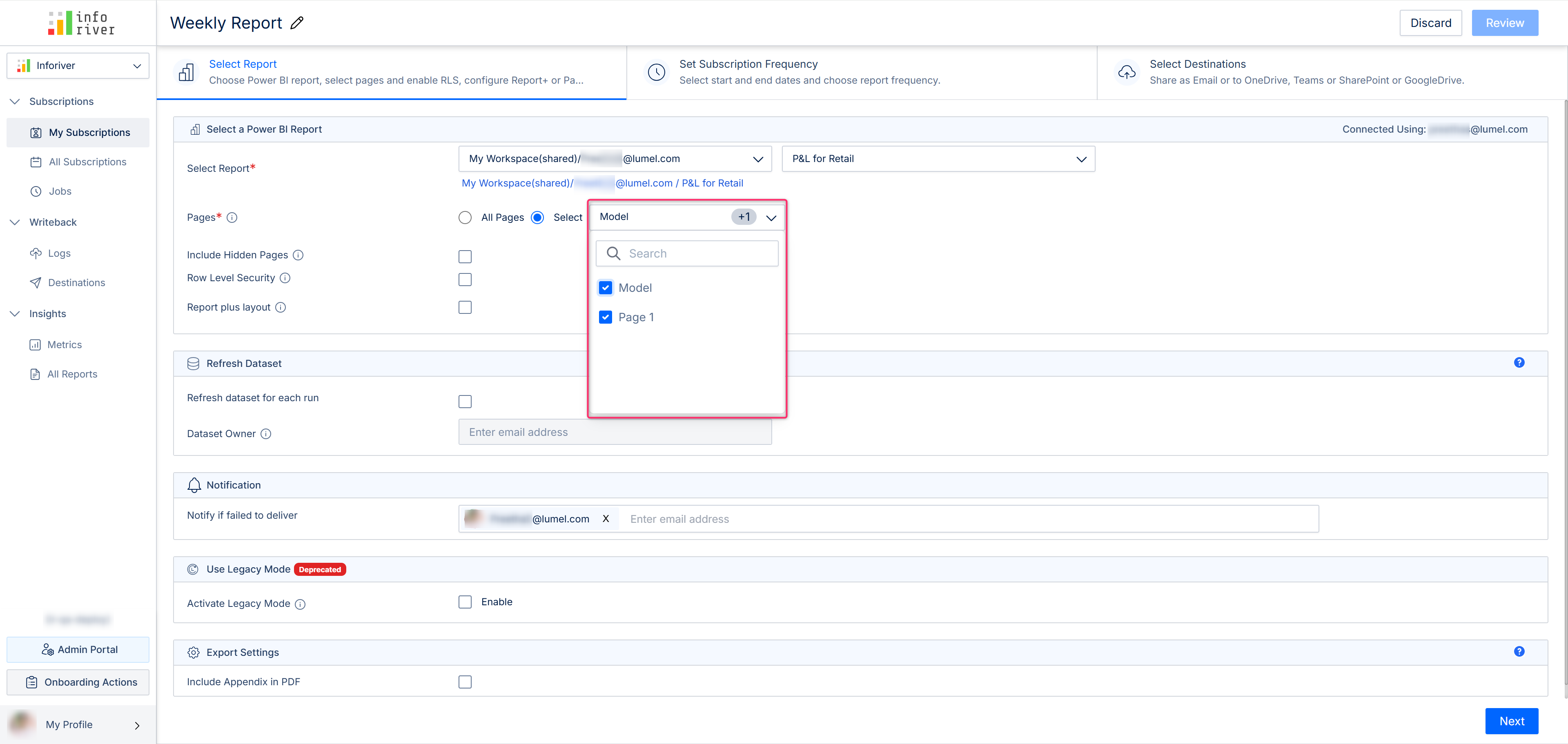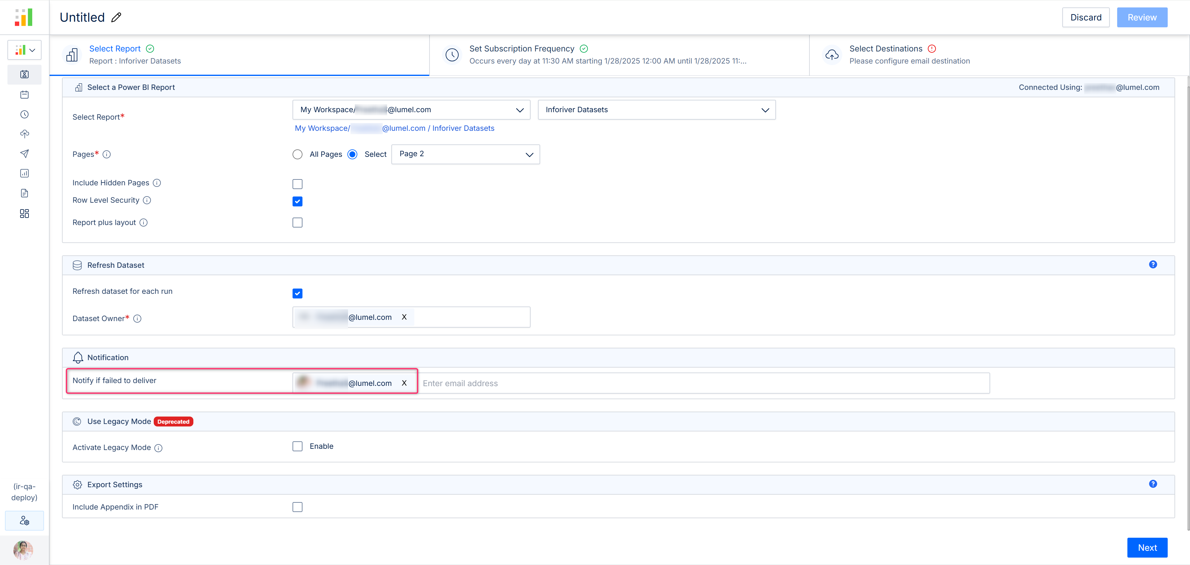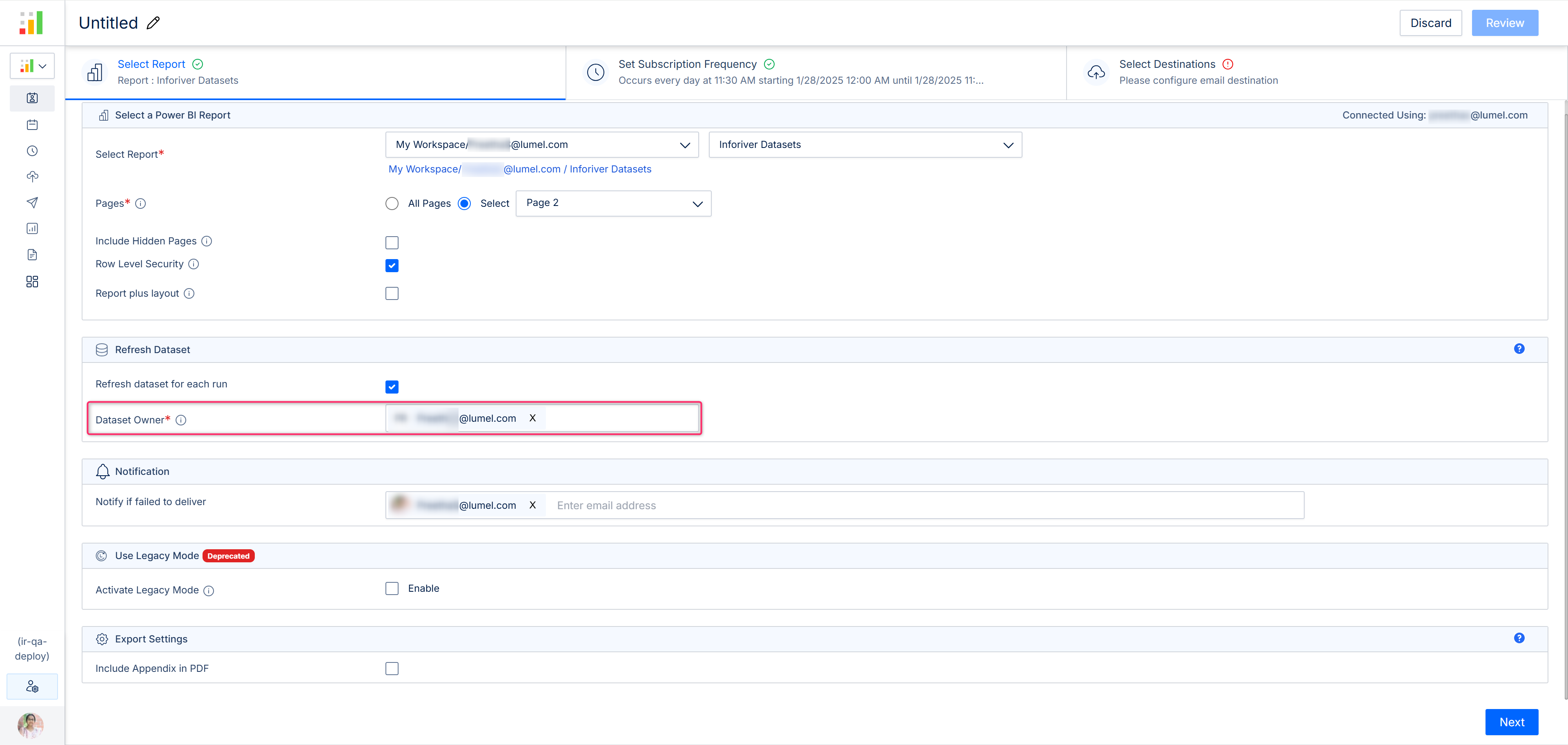 In the first drop-down, choose the Power BI workspace where the report you want to schedule is published.