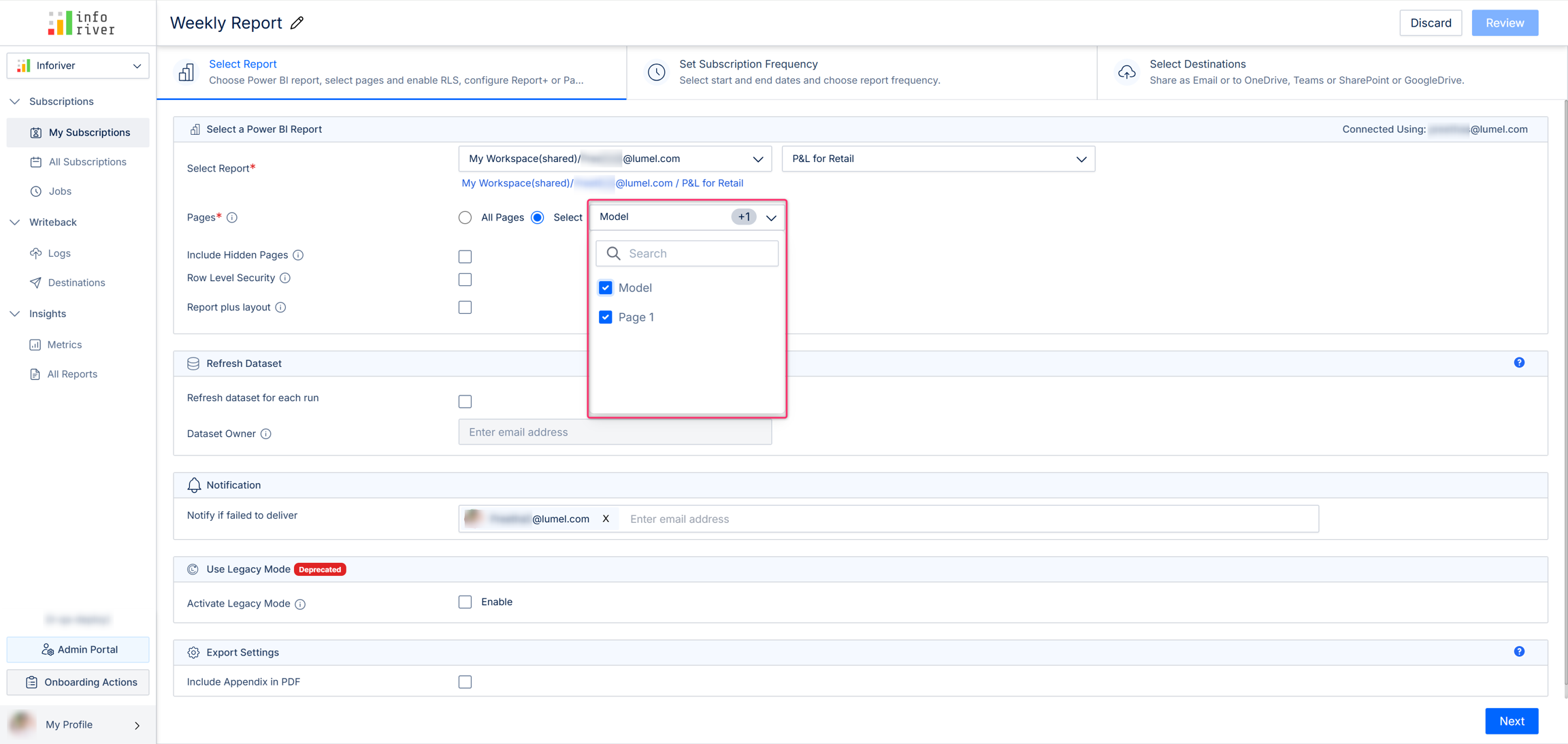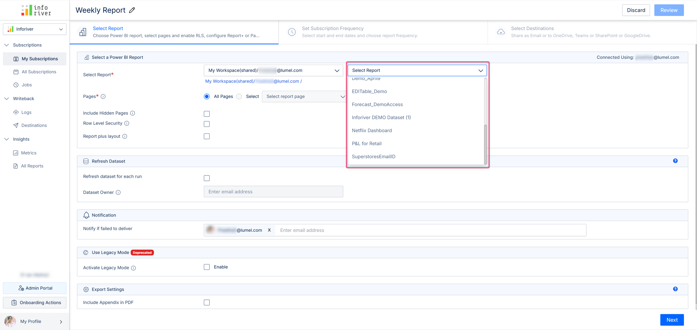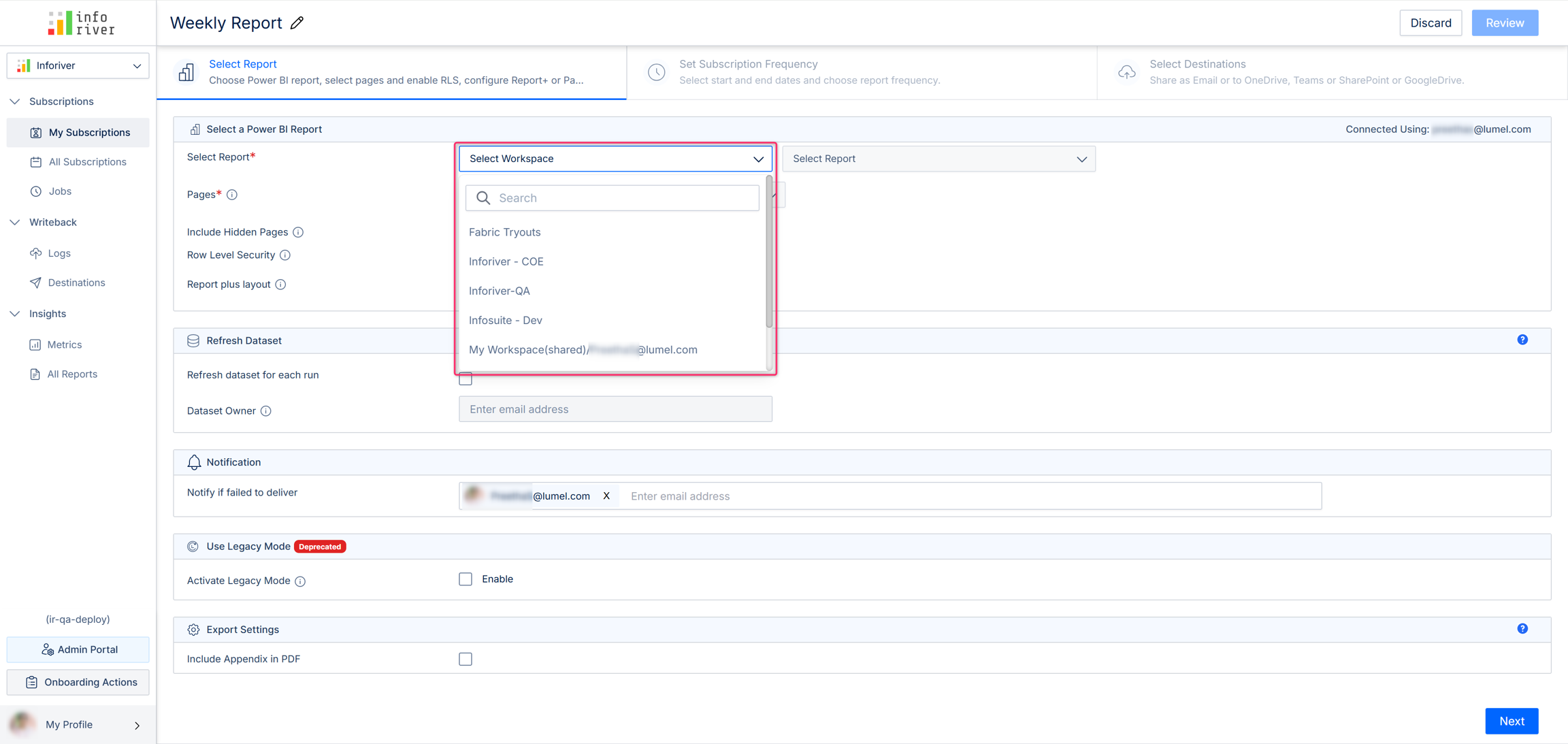 In the first drop-down, choose the Power BI workspace where the report you want to schedule is published.