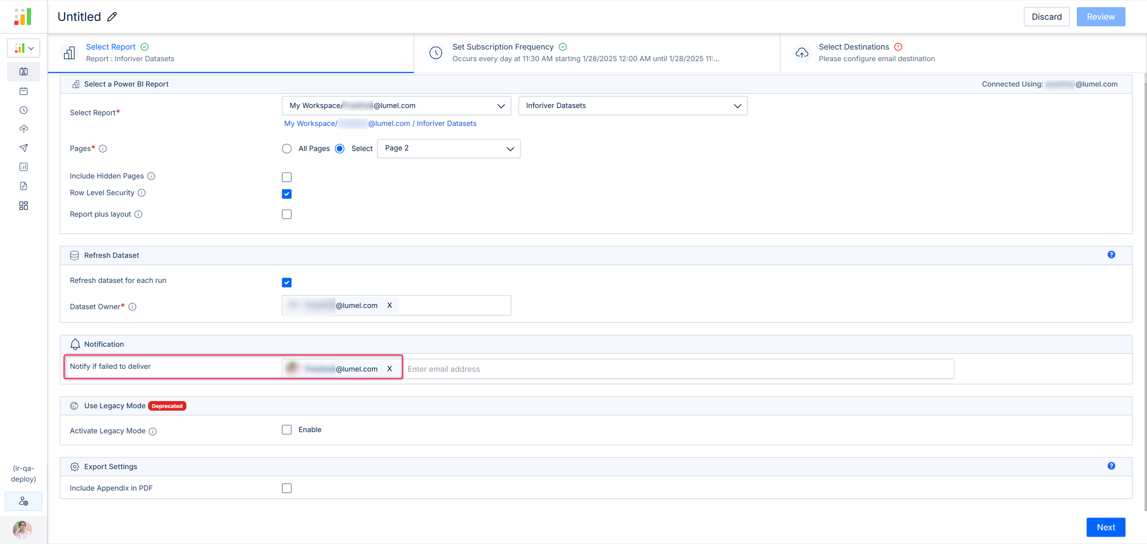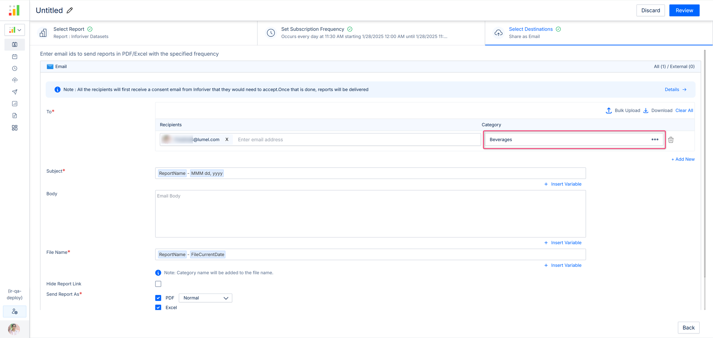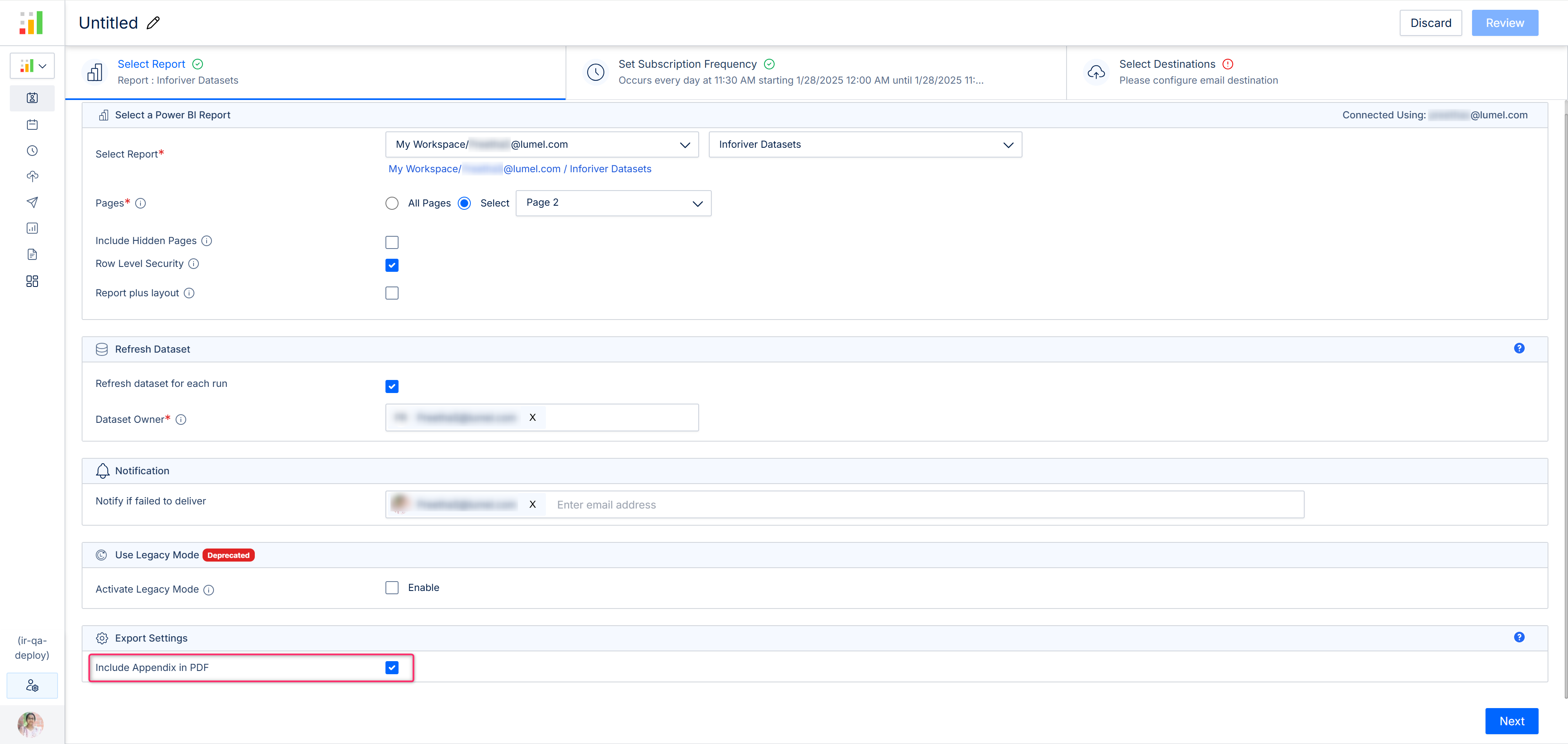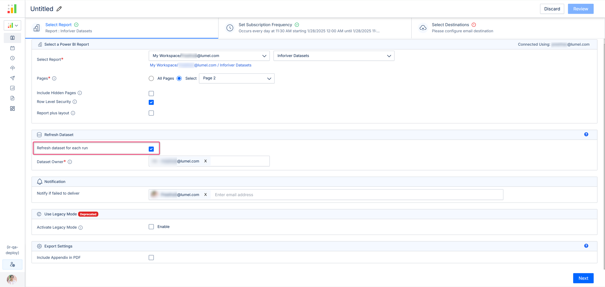 If you have reports where the data gets frequently updated and you want the updated data to be sent every time the schedule is run, then you can enable the 'Refresh dataset for each run' option. If this option is enabled, only 'Email' can be chosen as the 'Destination' and other third-party destinations won't be available.