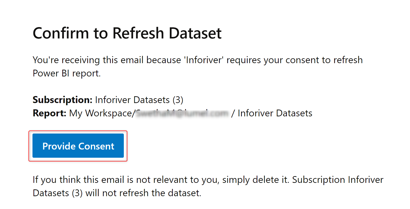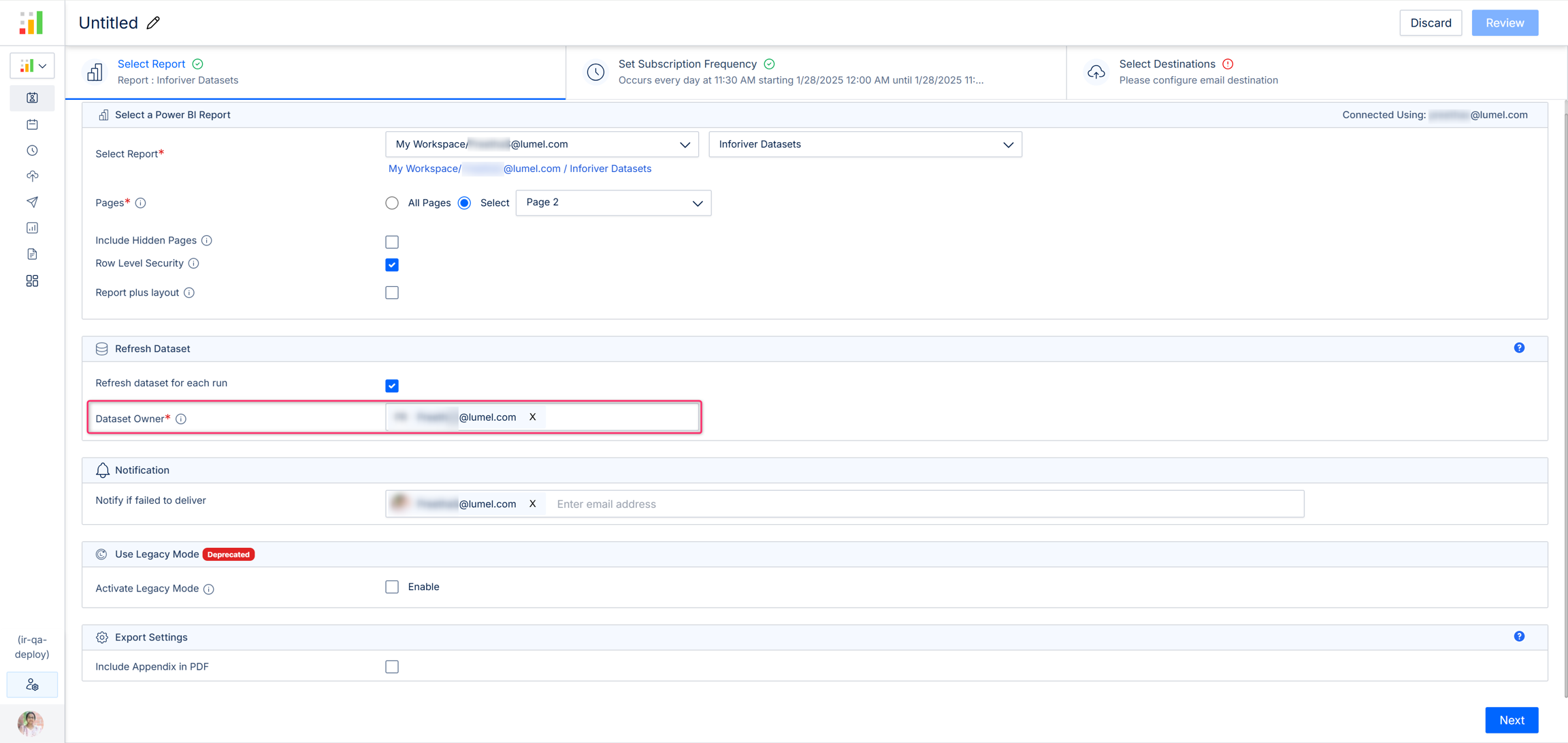 If the 'Refresh dataset for each run' option is enabled, a consent email must be sent before the data refresh. This email will be sent to the recipients specified in the dataset owner option.