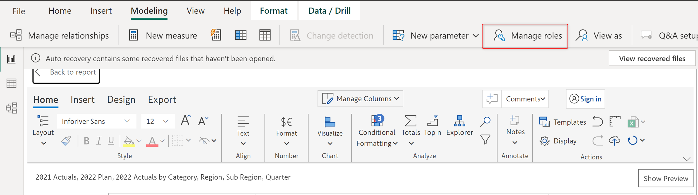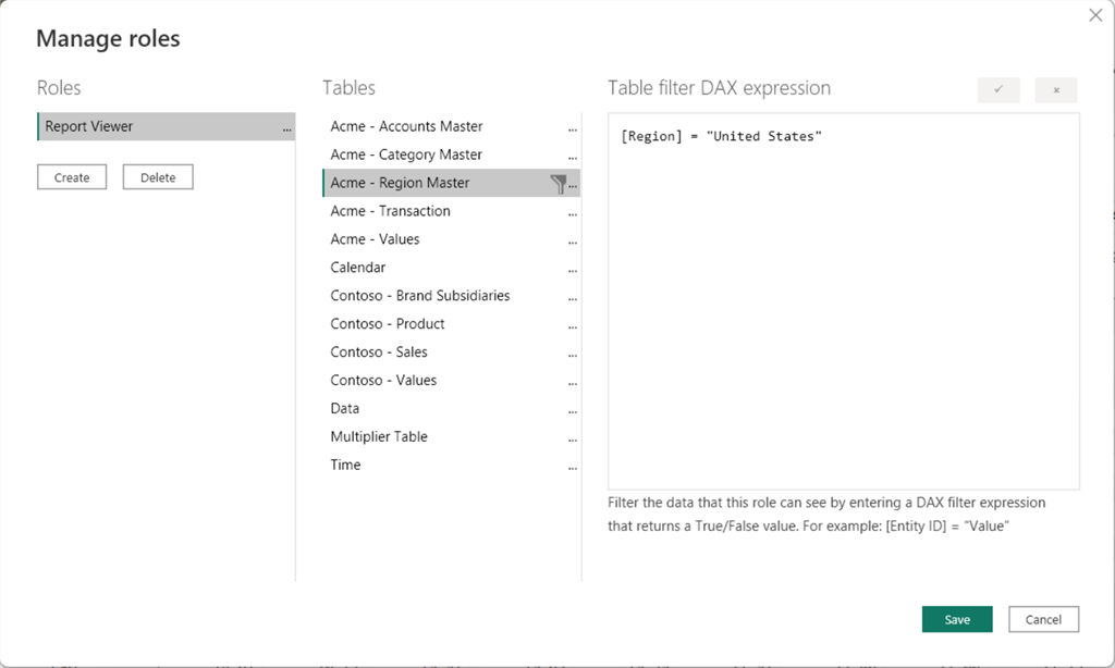 For example, in the following image, the 'Report Viewer' role has been set to view only the data related to the 'United States' region.