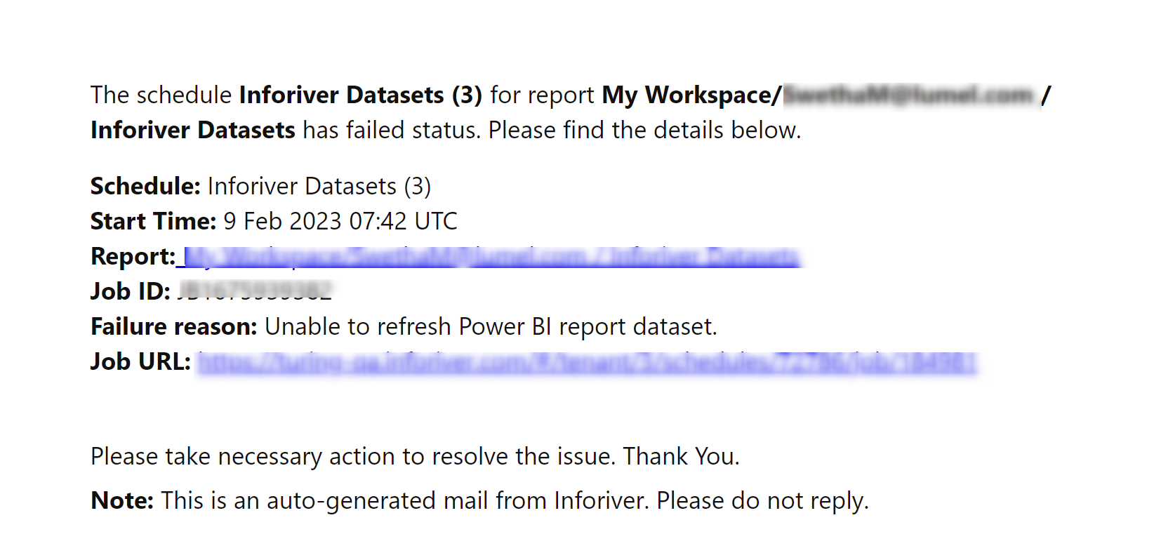 If in case any of the scheduled runs fails, then an email will be sent to all the selected members with the reason for failure, an error log, and a link to track back the error as shown in the image below.