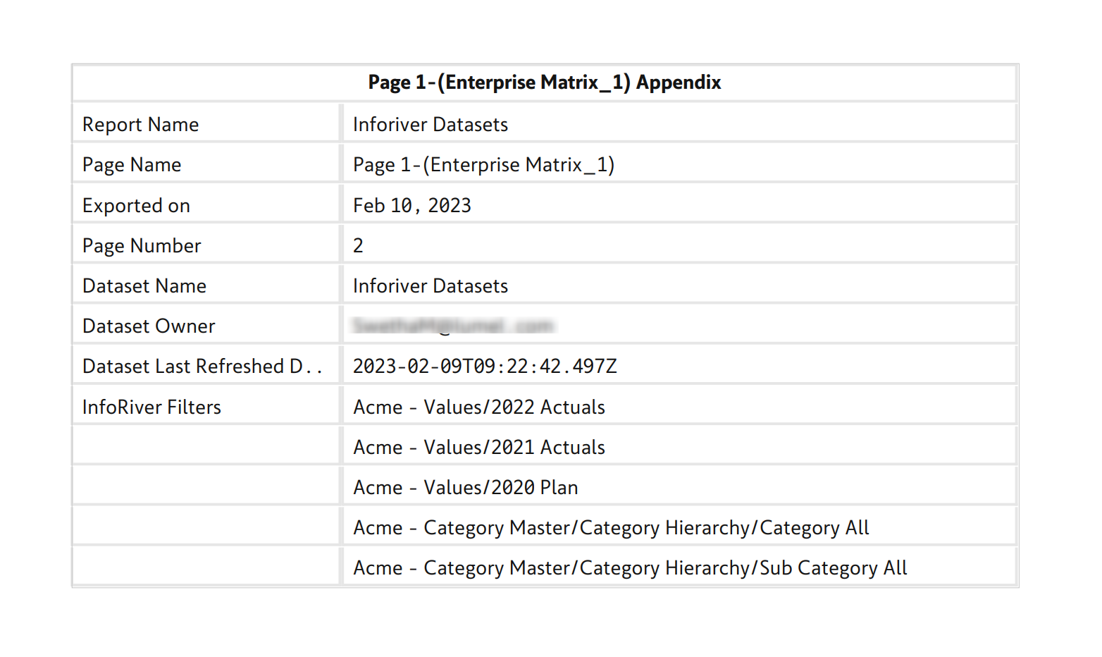 Enabling this option will display an appendix for each report page with information like the font used, page name, filters applied, etc.
