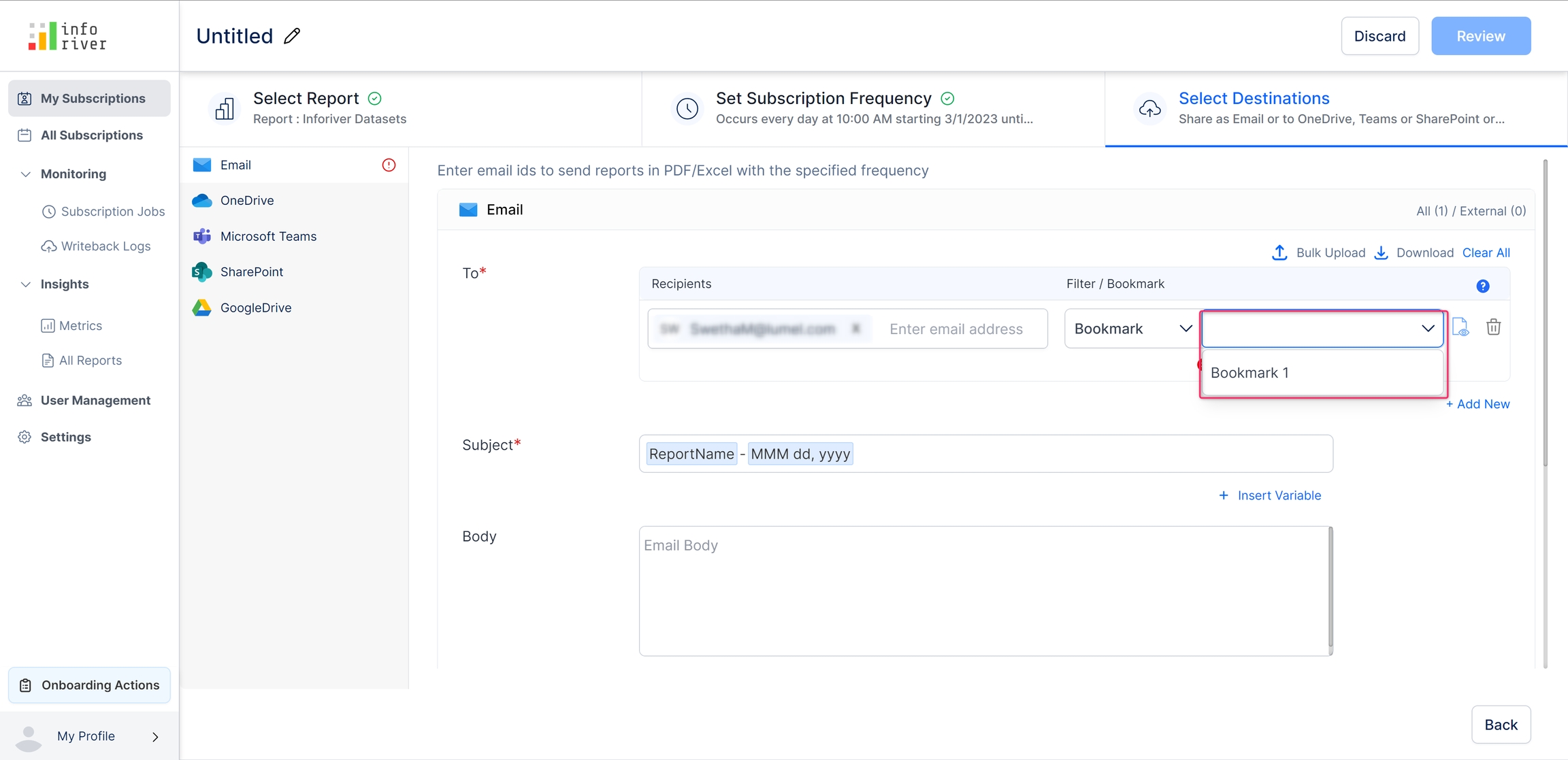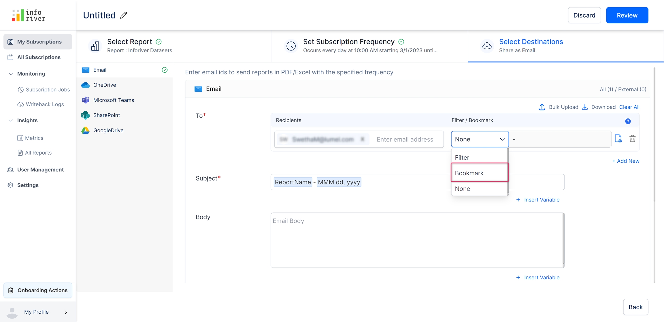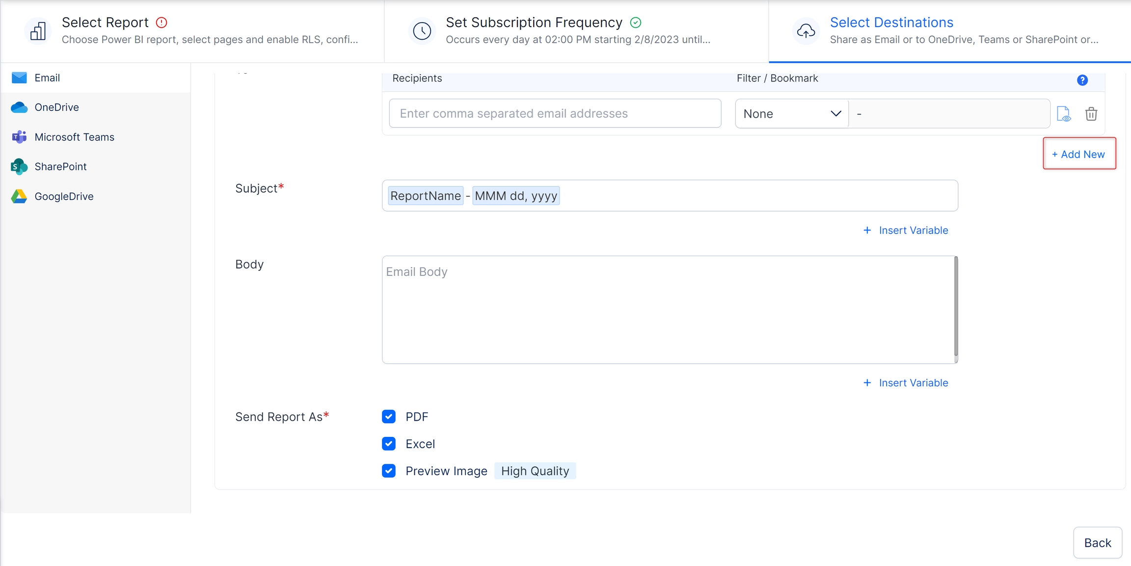 Here you can select the destination(s) to which you want the send the reports. The scheduled reports can be exported to any of the following destinations: Email, OneDrive, Microsoft Teams, SharePoint, and Google Drive.