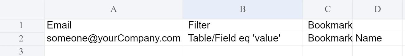 You can also bulk upload a CSV file containing the filters and bookmarks applied on the report. Click the 'Bulk upload' option. This will open up the bulk upload modal as shown in the image below.