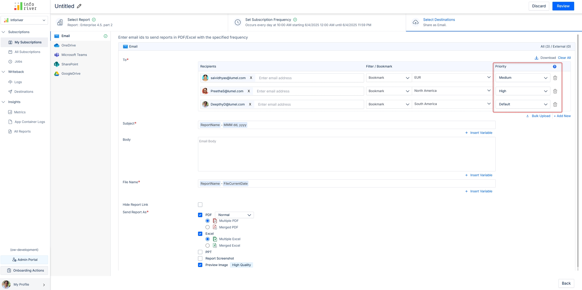 If you have bookmarks and filters in your reports, you can set individual priorities for each. The priorities set for bookmarks/filters will be automatically cascaded across all destinations; i.e., if you set the priority for an email destination, it will be replicated across all other destinations.