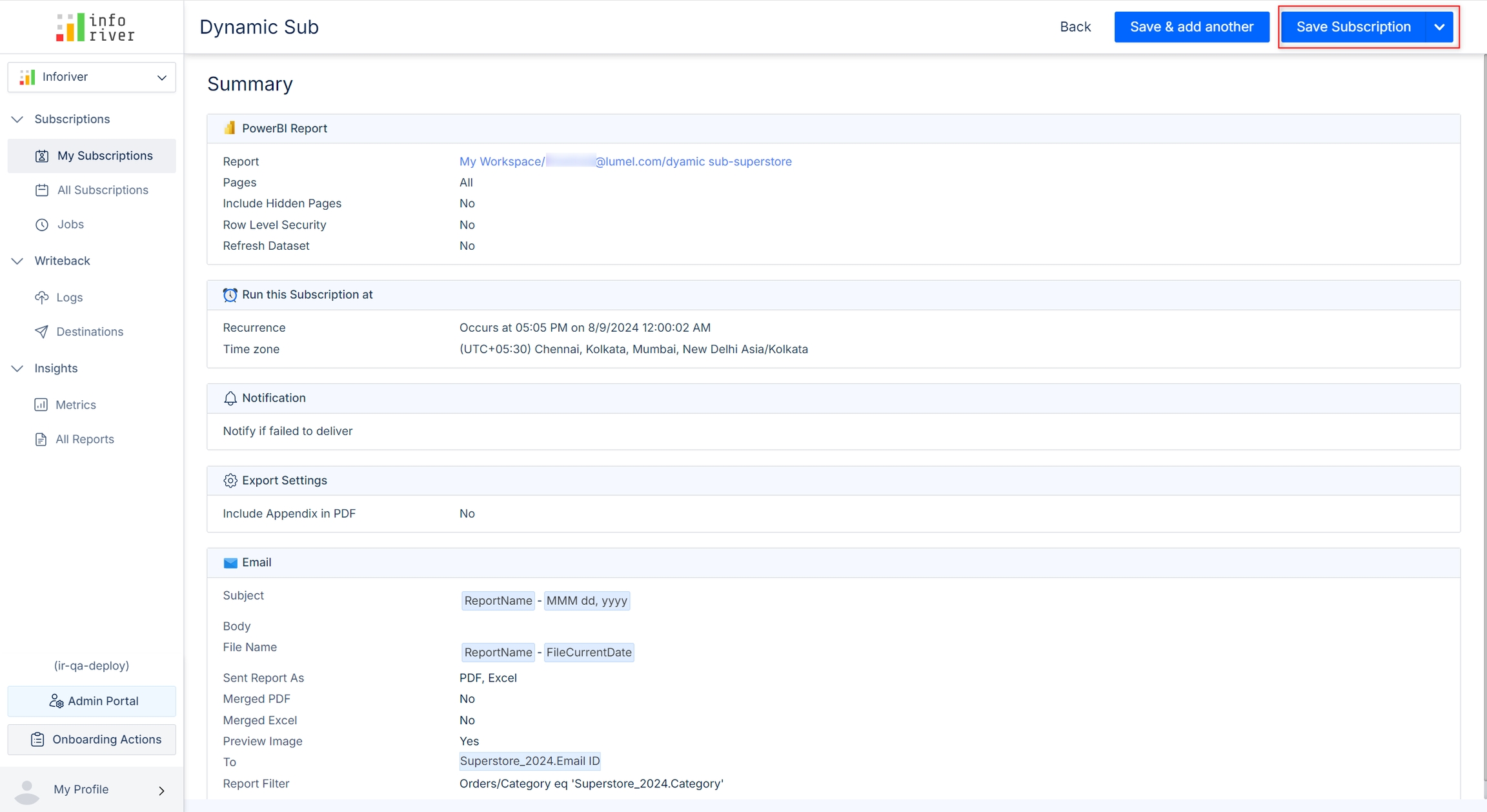 On the next page, review the settings and select Save Subscription. The subscription is created.