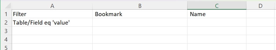 Filter: If a filter is applicable, use the format: <Table name>/<Field name> eq 'Value'. Consider a filter applied to select US regions only. If the name of the table is 'Region' and the name of the field is 'Country', the filter value should be Region/Country eq 'US'.