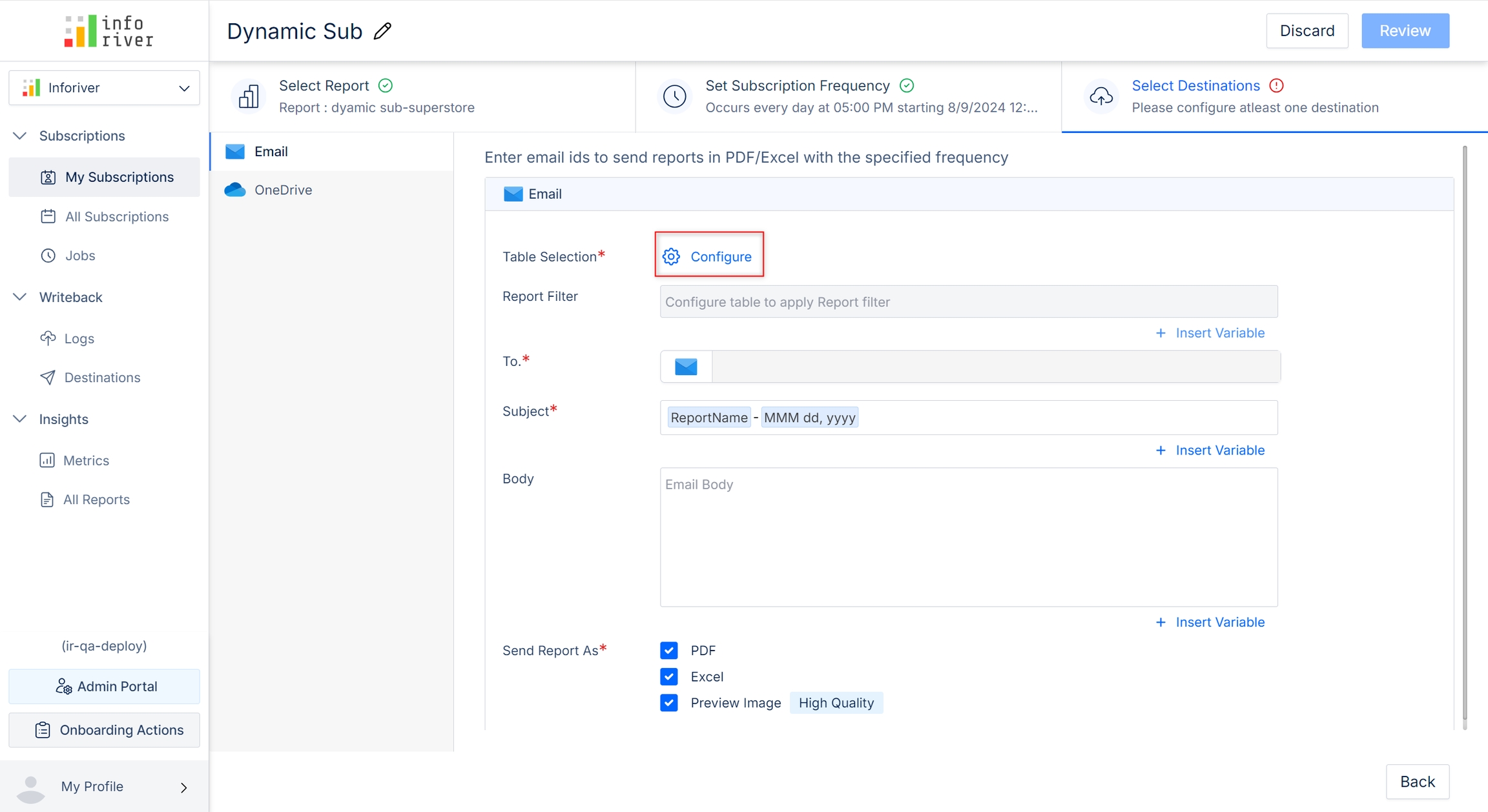 The next step is to review the settings and save them to start the subscription. Navigate to this section for illustration, or the next section to understand the configuration for different destinations.