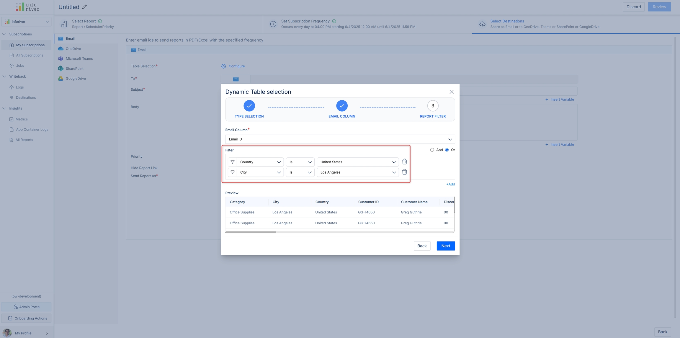 Set up a filter on the semantic model/CSV - the subscription will be sent only to those Email IDs. In this example, we are only sending the data for the Email IDs under United States and Los Angeles.