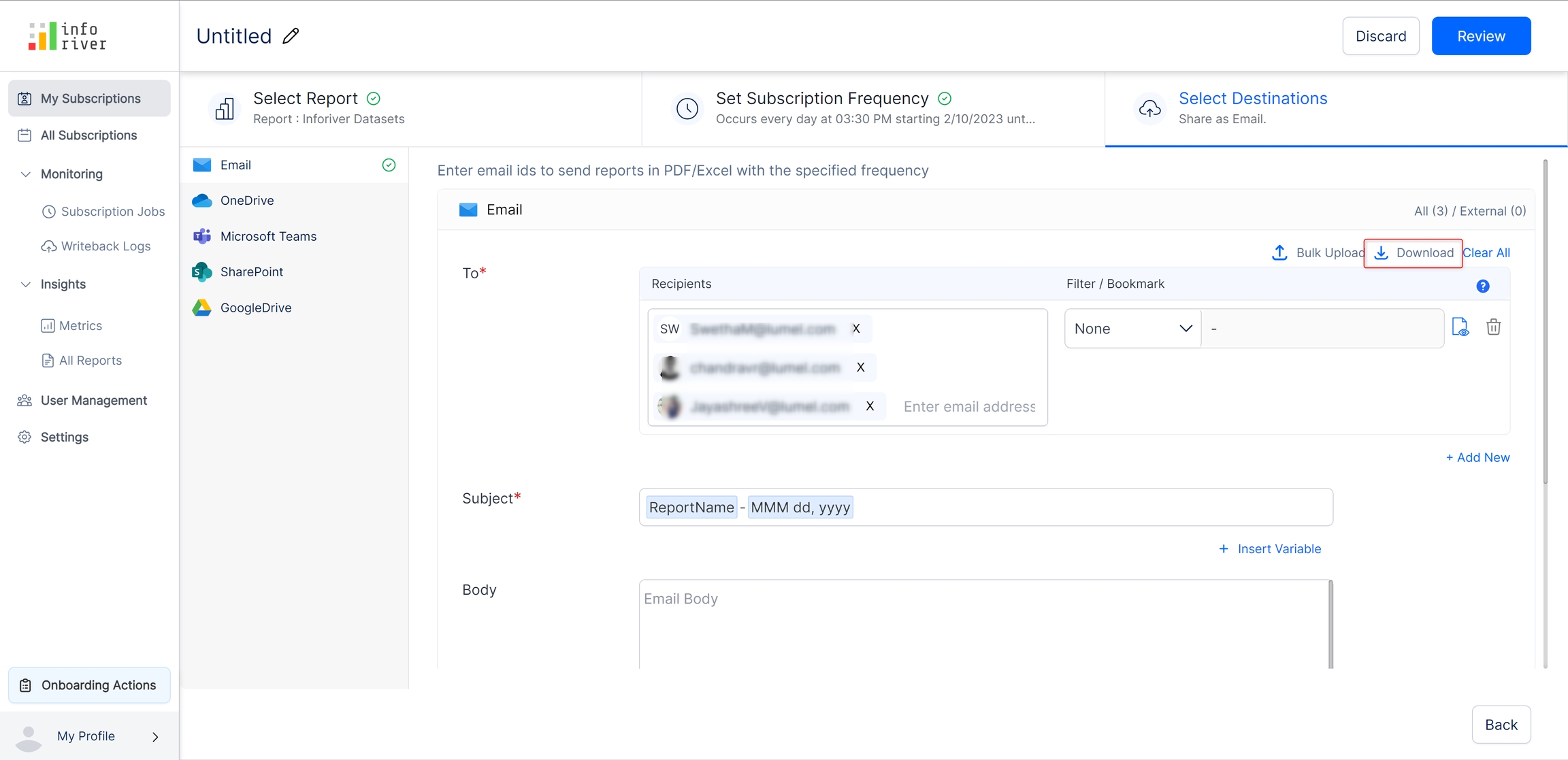 Clicking on this option will download the entered recipient's email address and filter/bookmark selection as a CSV file.