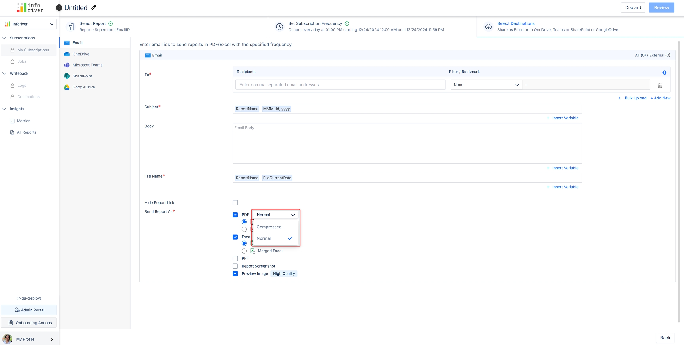 Inforiver generates fully formatted, high-resolution PDF extracts of your reports. For large reports, this can result in very large files. You can choose to compress the extract and generate smaller files by selecting the Compressed option.