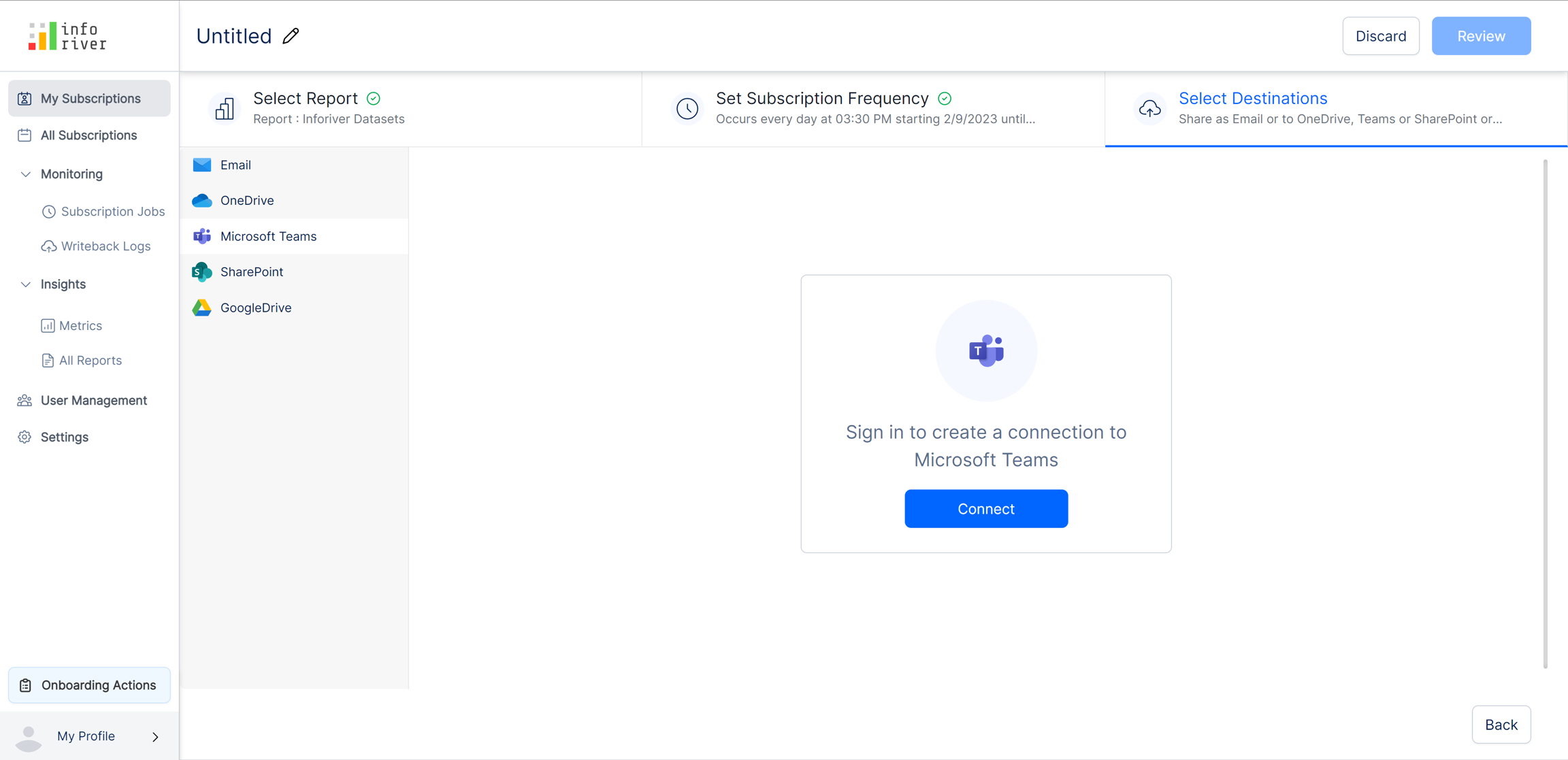To set Microsoft Teams as the destination, select the 'Microsoft Teams' option from the left pane. If you haven't connected your Microsoft account, you will get the following screen shown in the image below.