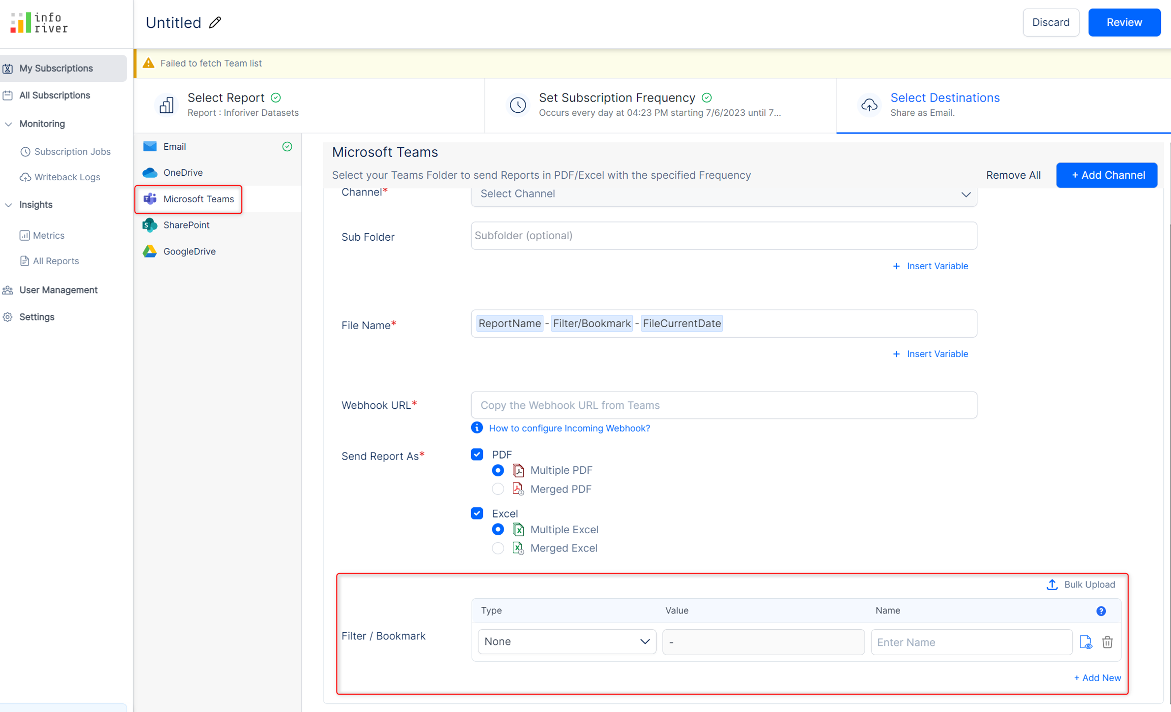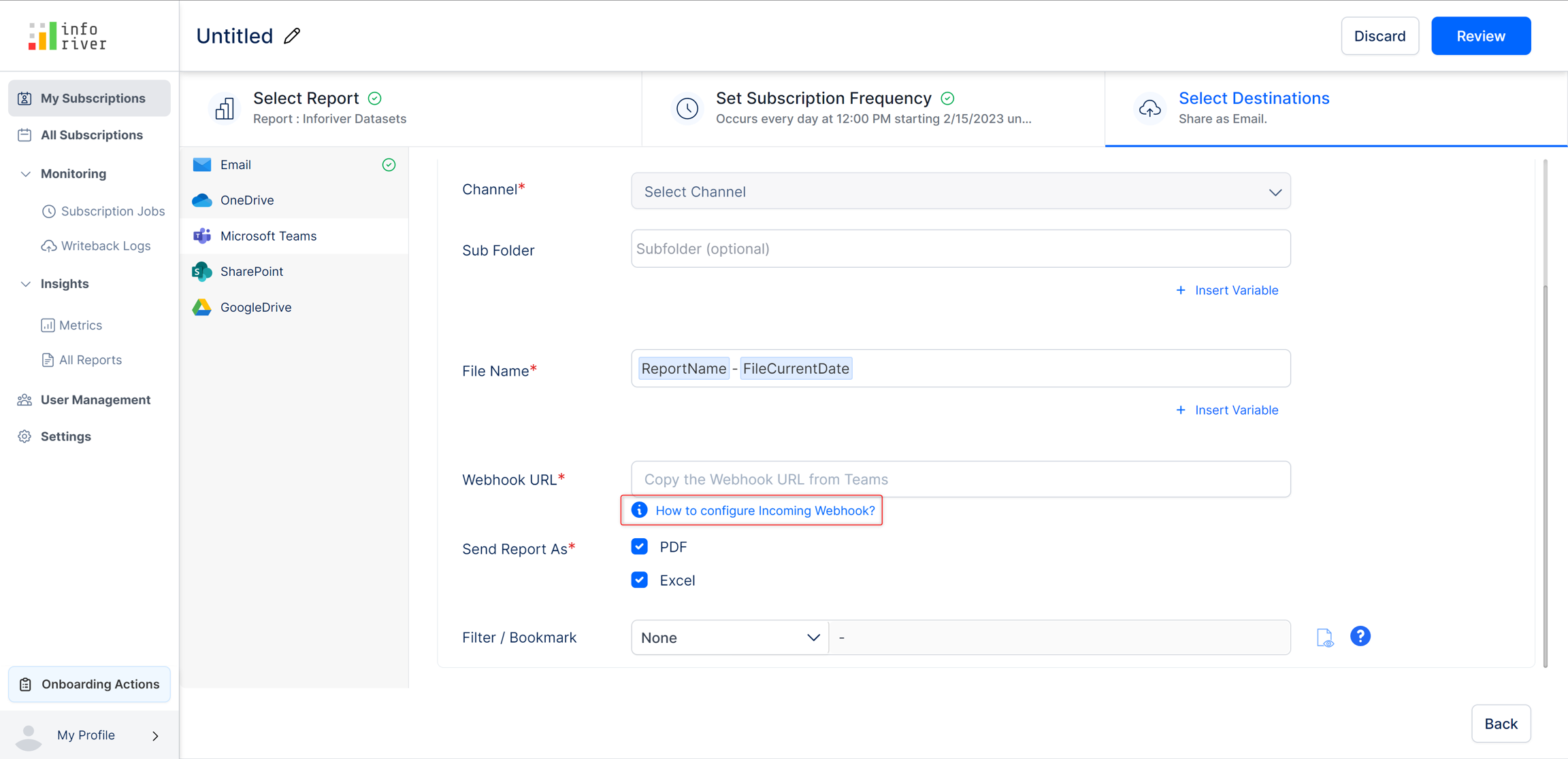 You can optionally specify the destination subfolder to be created inside the chosen team's channel. The report will be exported to the subfolder if selected.