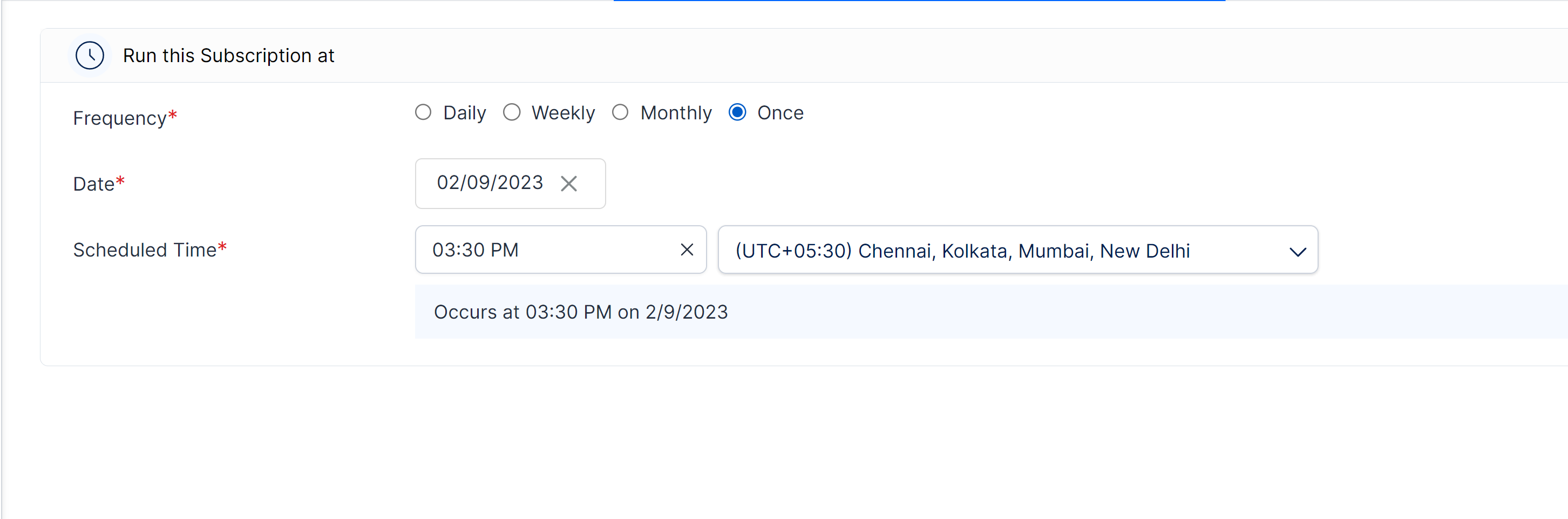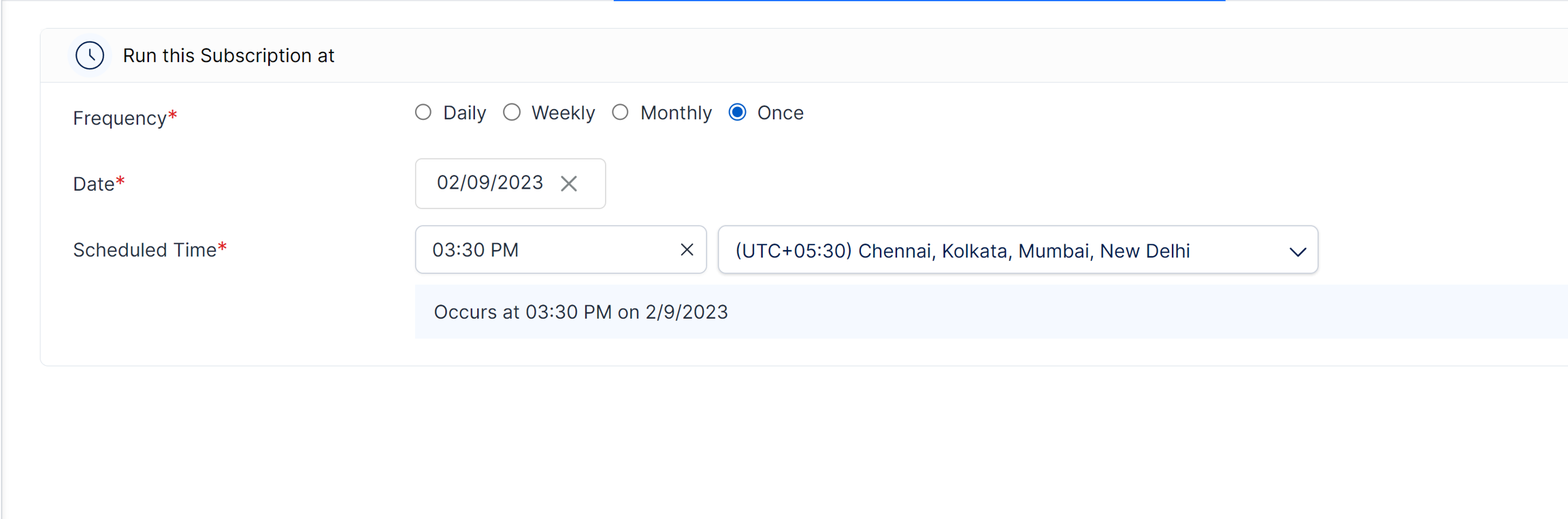 Once: Selecting this option will run the scheduler only once. You can specify the exact date and time at which the scheduler should run.