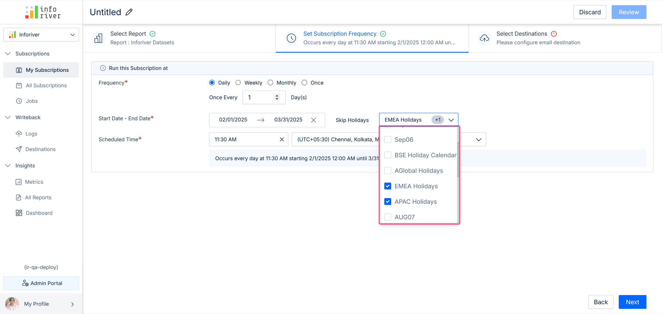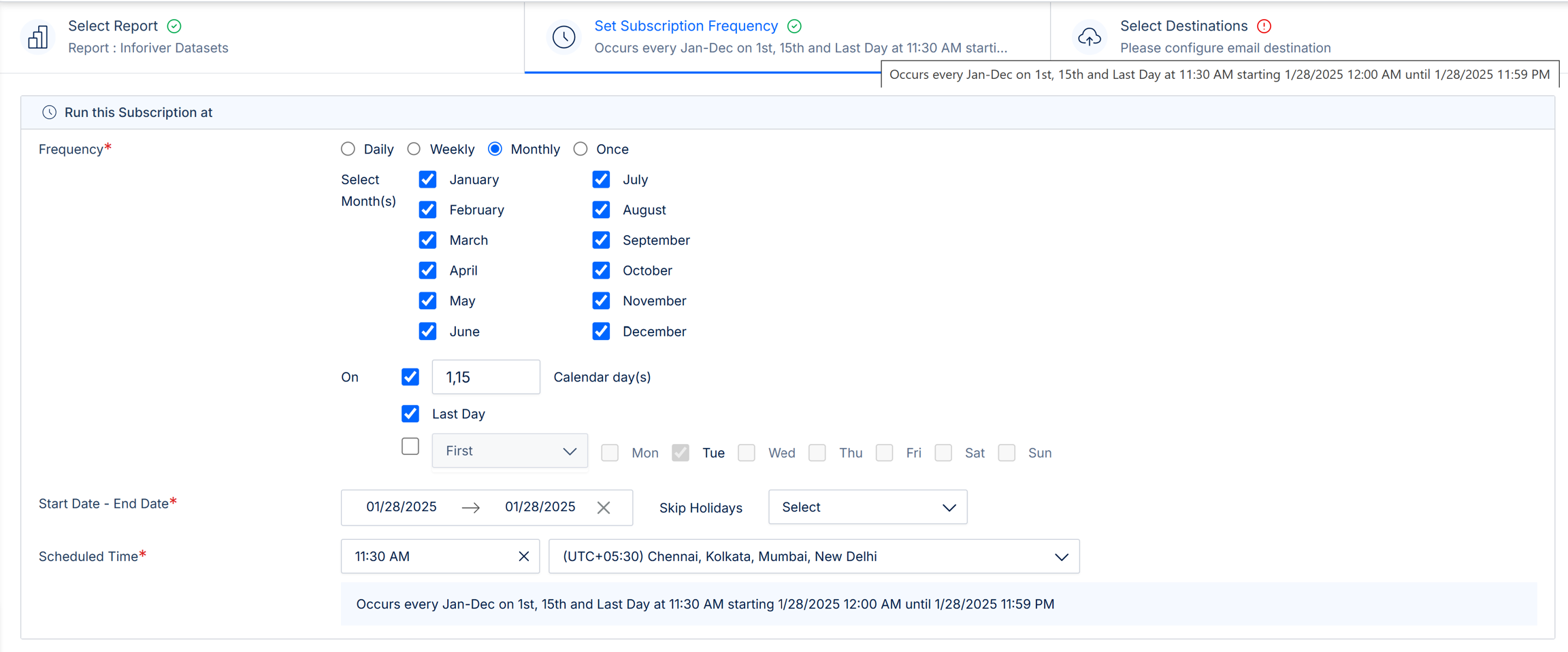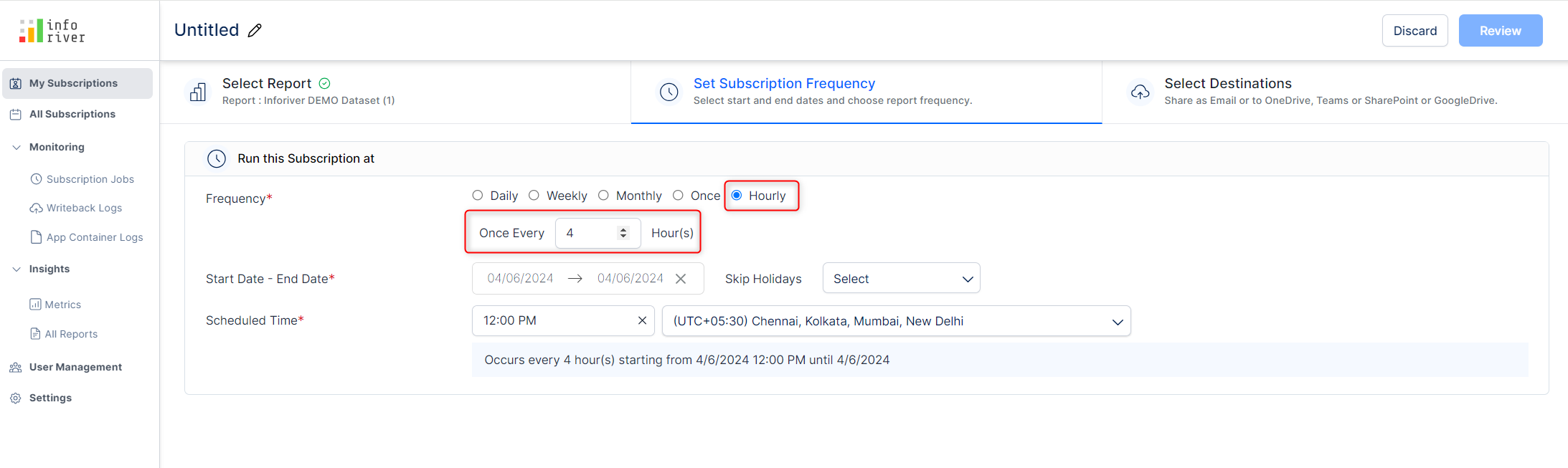 Here you can specify how frequently the subscriptions should be run. The report deliveries are scheduled according to the set frequency, start date, end date, and scheduled time.