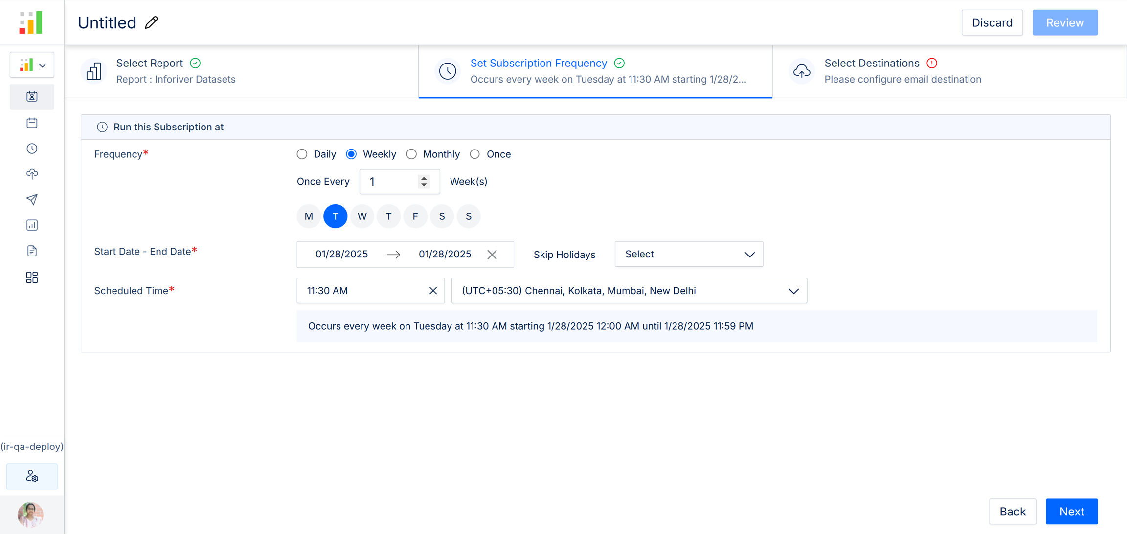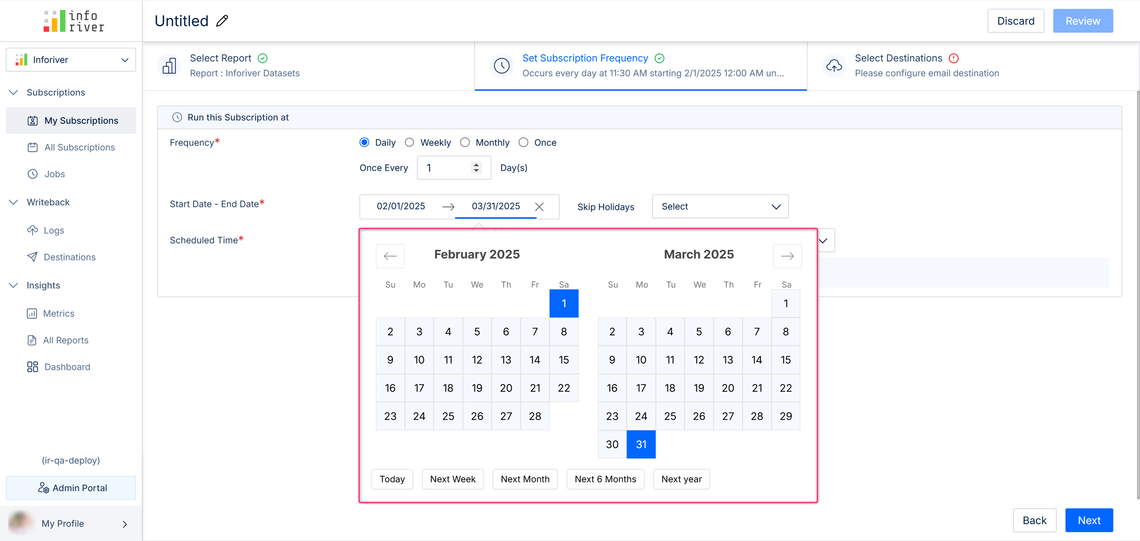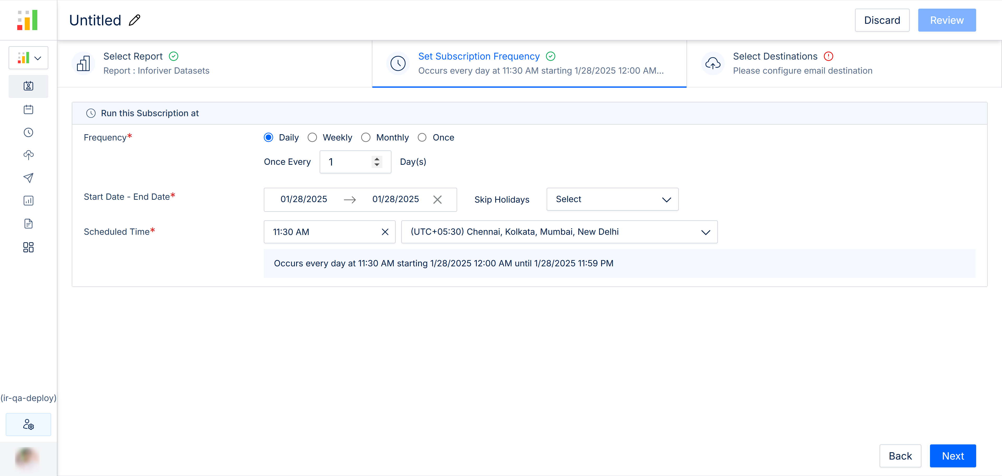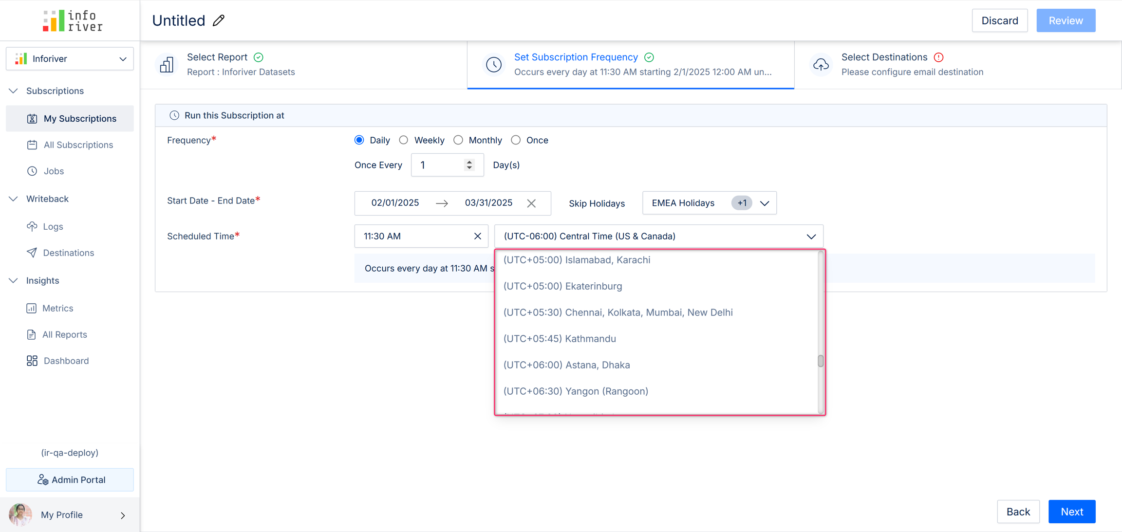 Here you can specify how frequently the subscriptions should be run. The report deliveries are scheduled according to the set frequency, start date, end date, and scheduled time.