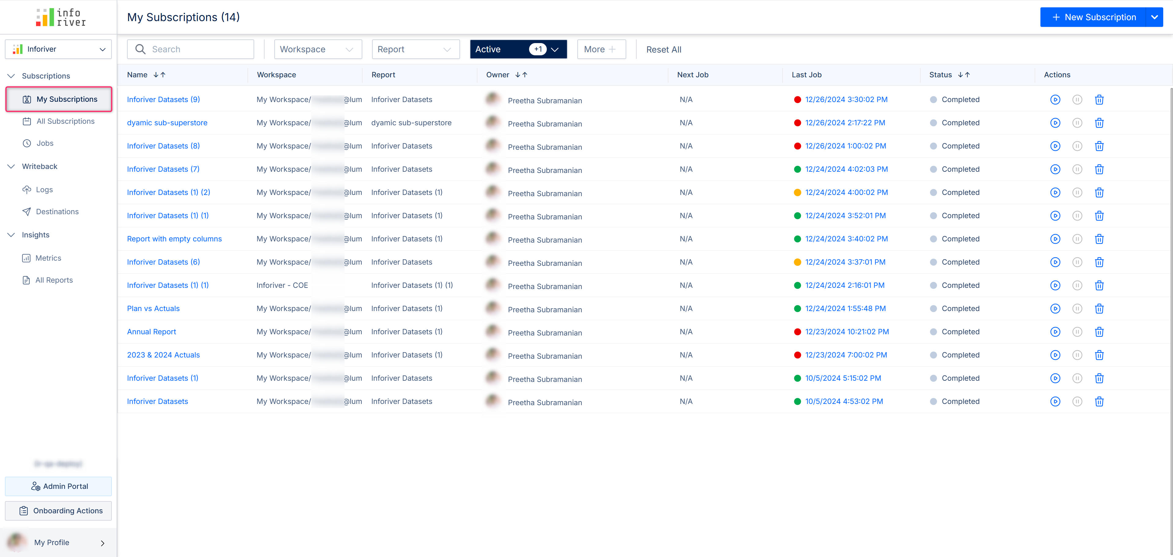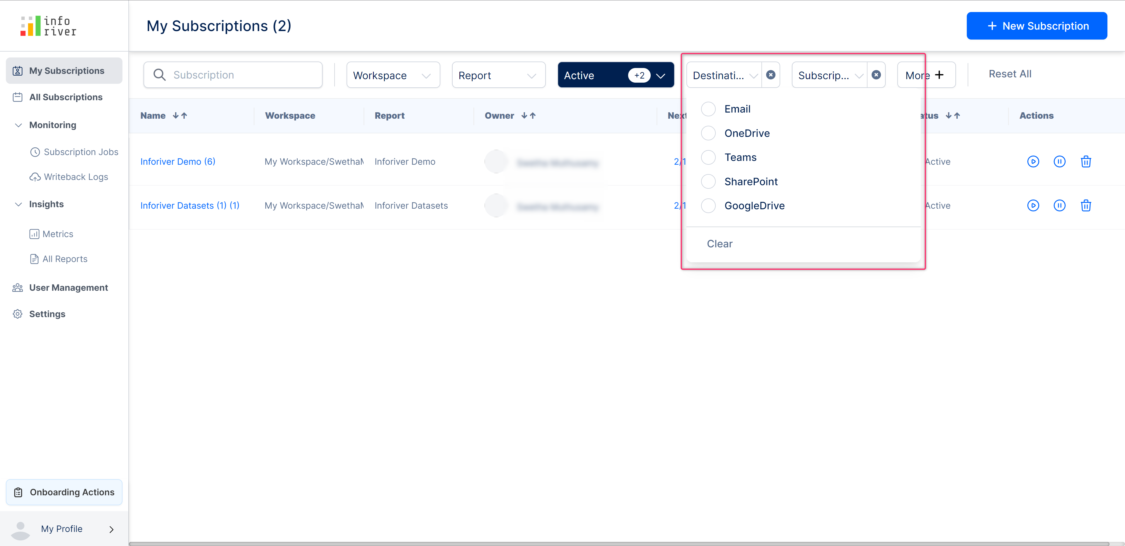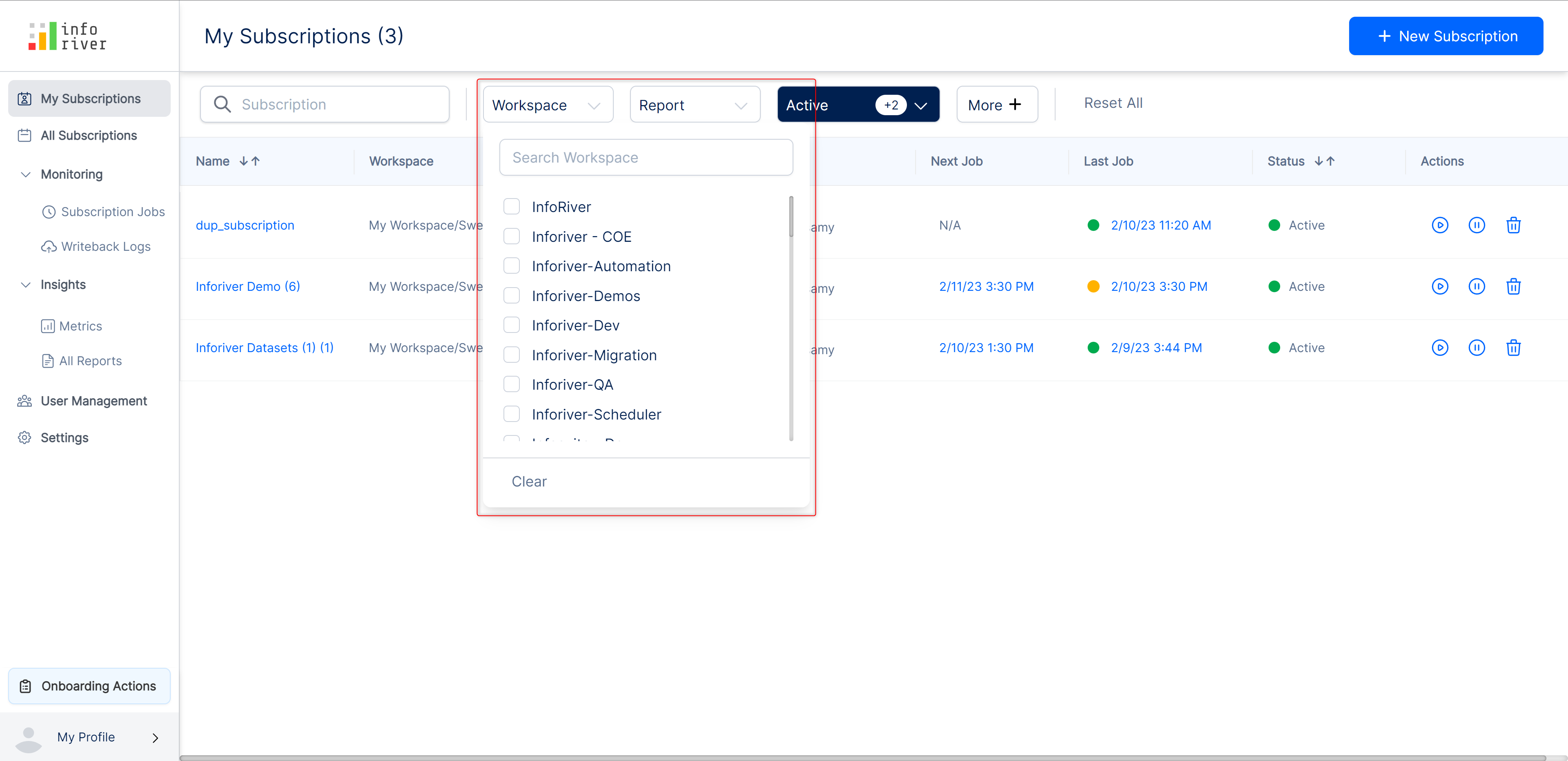 Using this drop-down you can filter the subscriptions based on the workspaces. Only the subscriptions of the selected workspaces will get displayed.