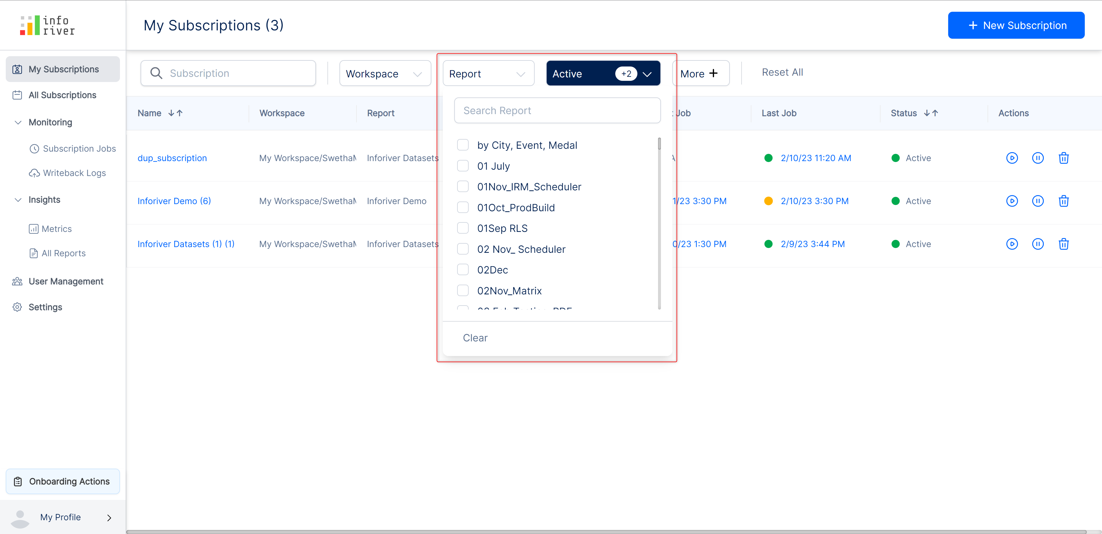 Using this drop-down you can filter the subscriptions based on the reports. Only the subscriptions of the selected reports will get displayed.