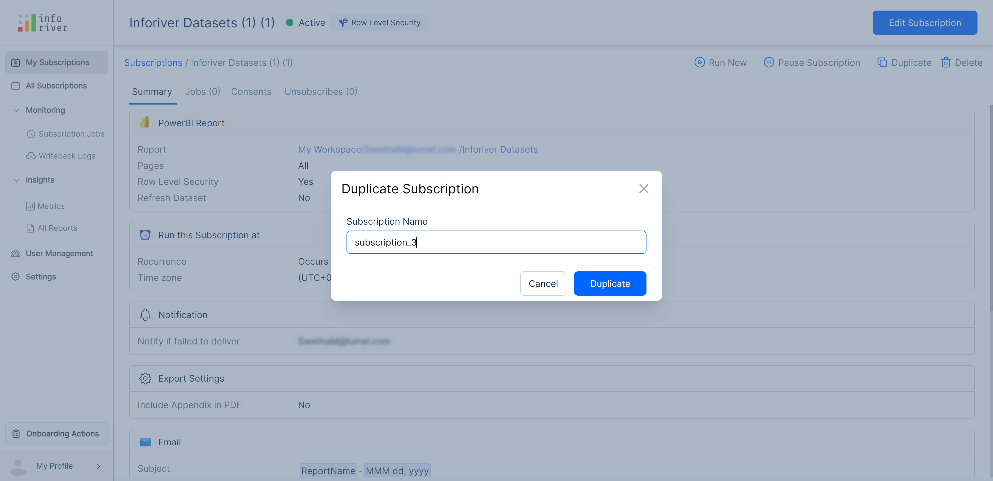 * **Duplicate -** Clicking on this icon will duplicate the chosen subscription