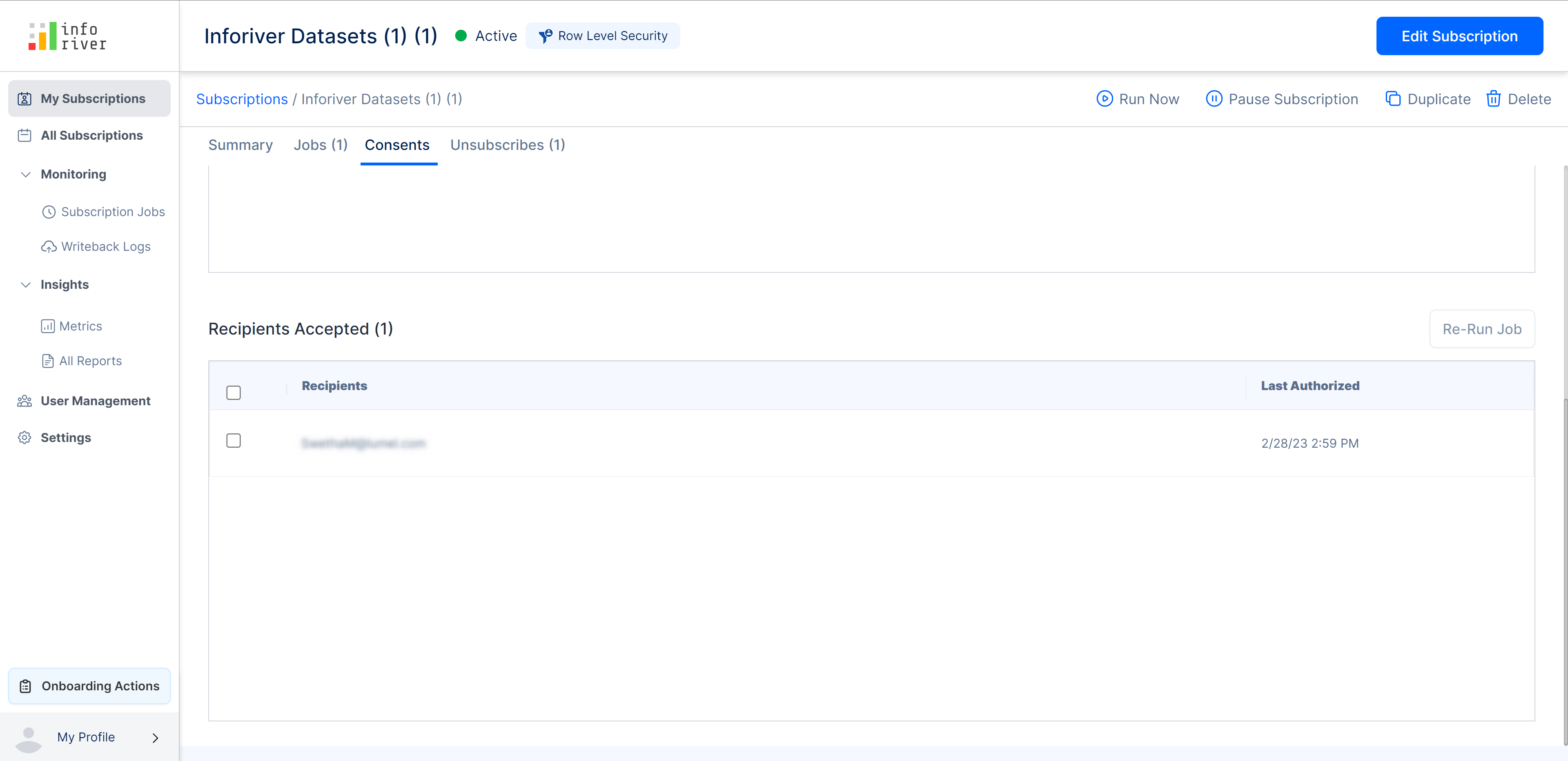 You can also select any of the recipients by enabling the checkbox next to their corresponding email. If any of the checkboxes are enabled, then the 'Re-run job' button becomes available at the top-right corner of the page.&#x20;