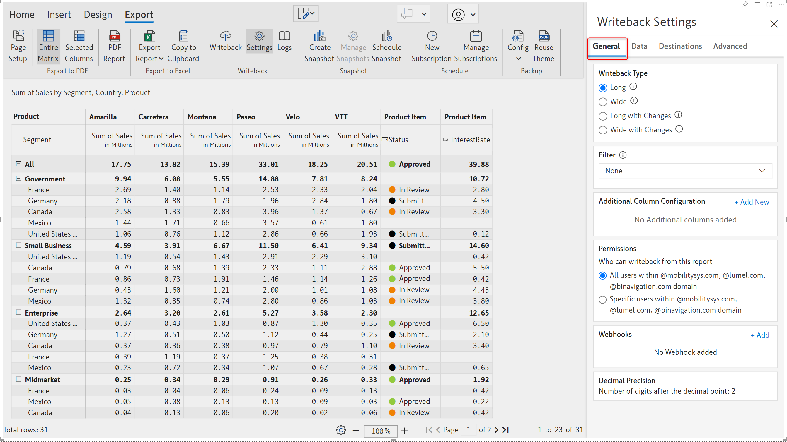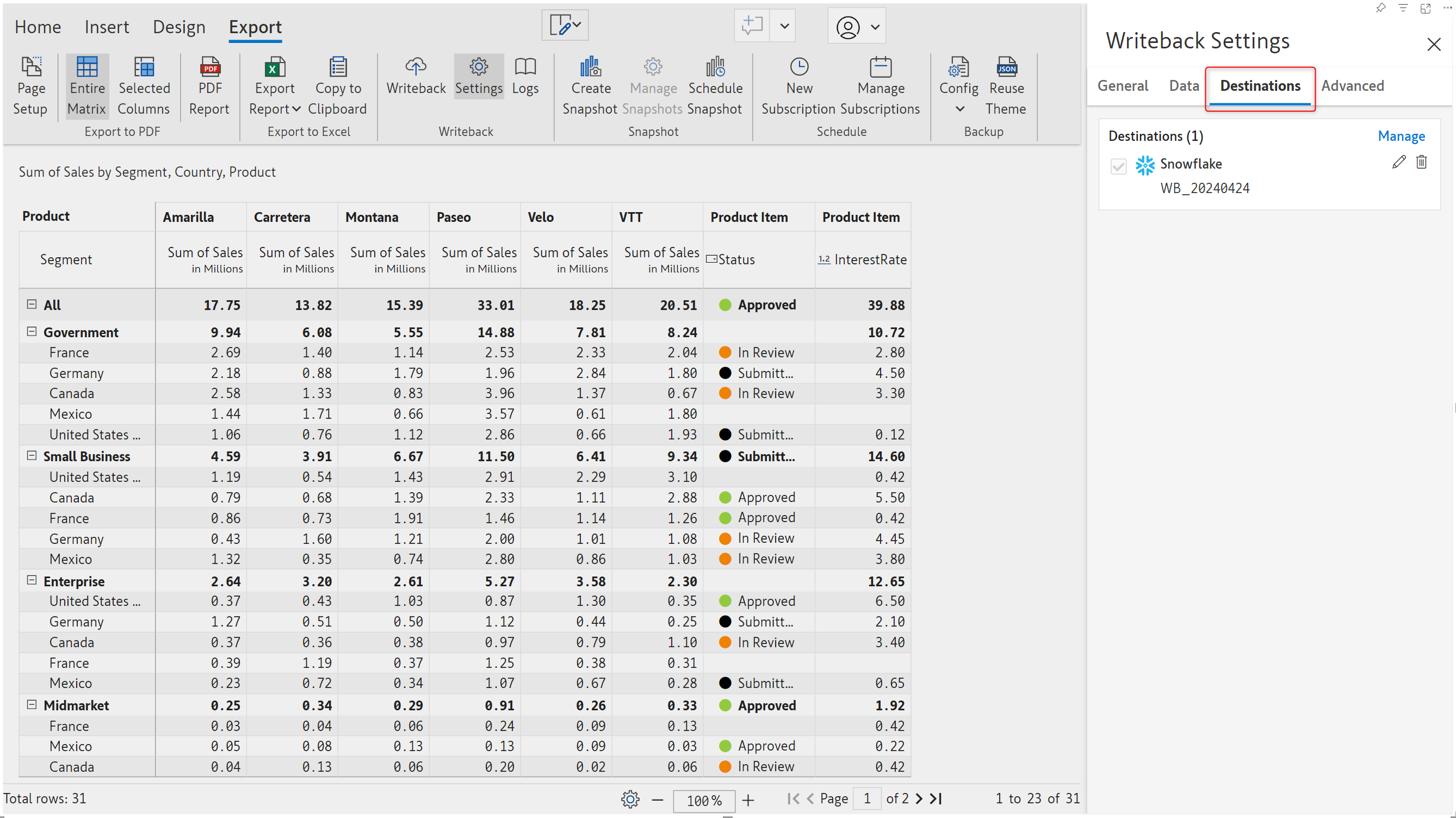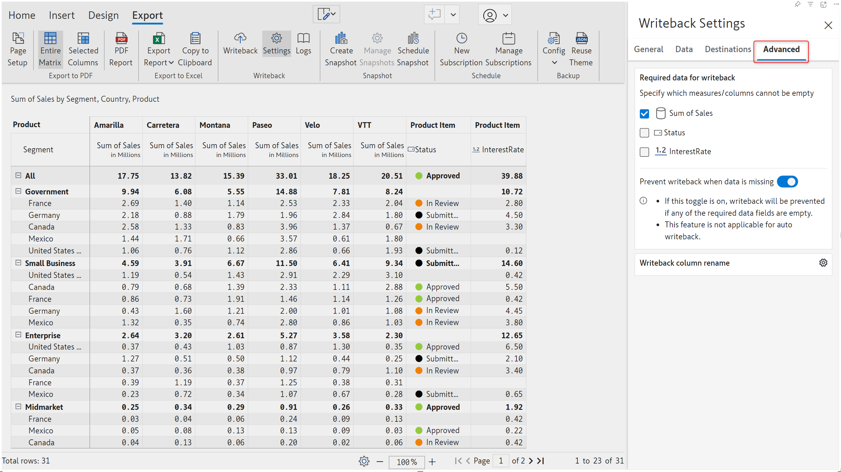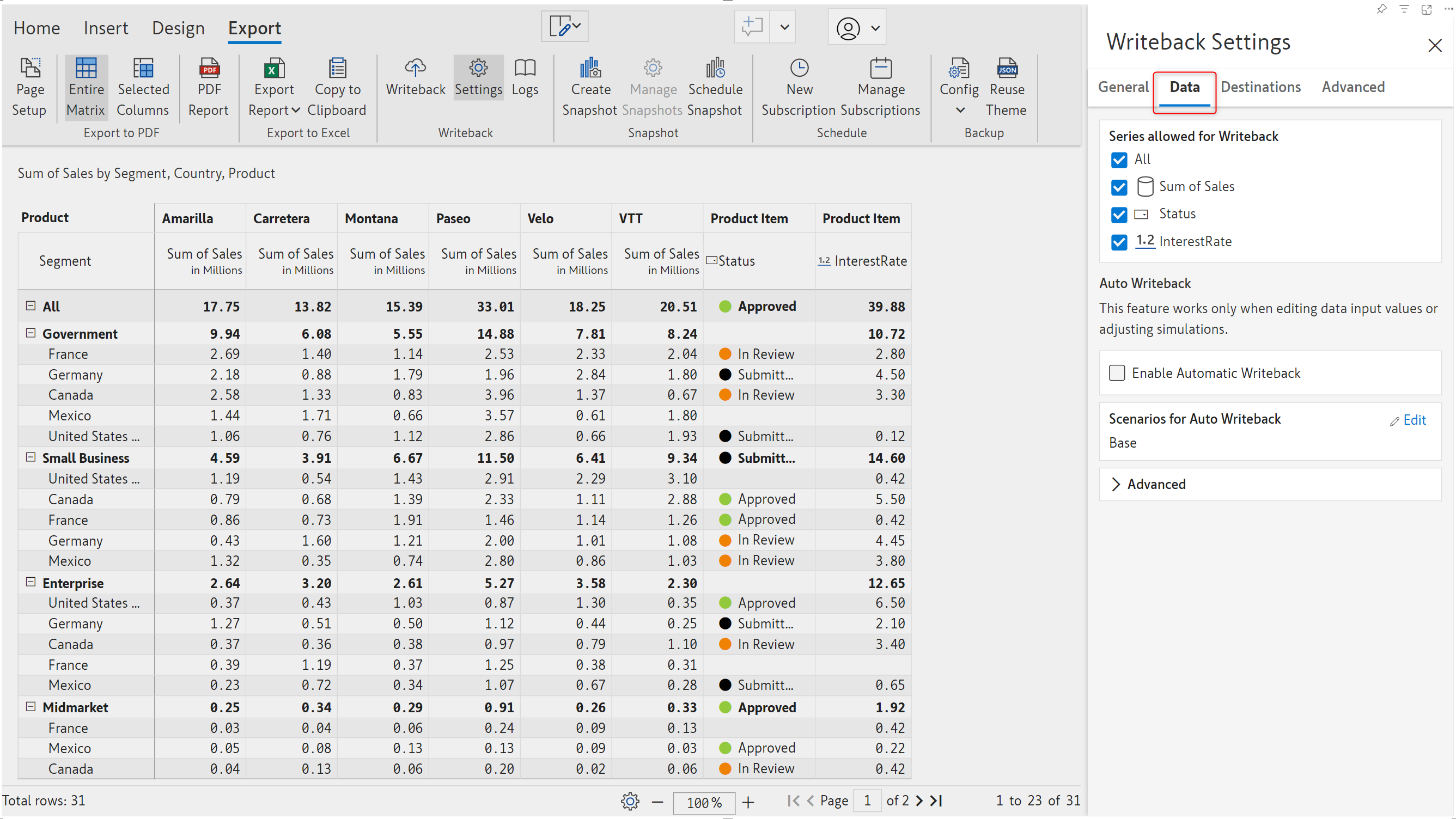 **STEP 1:** Navigate to the Export ribbon and click the Settings button to open the writeback settings side pane.