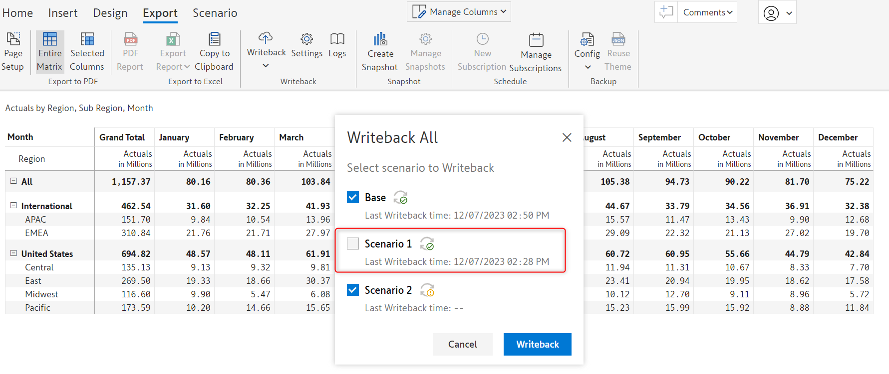 Selecting 'Writeback All' will open a dialogue box, which lets you choose which scenarios to writeback. If you do not want a particular scenario to be exported - uncheck the box adjacent to the name of that particular scenario.