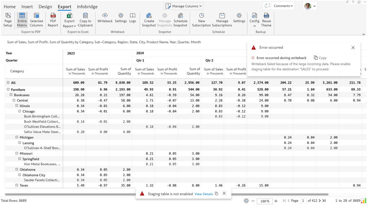 Inforiver writeback allows a user to export and save a report table to destinations of different types including file destinations, data warehouses, and data lake storage.&#x20;