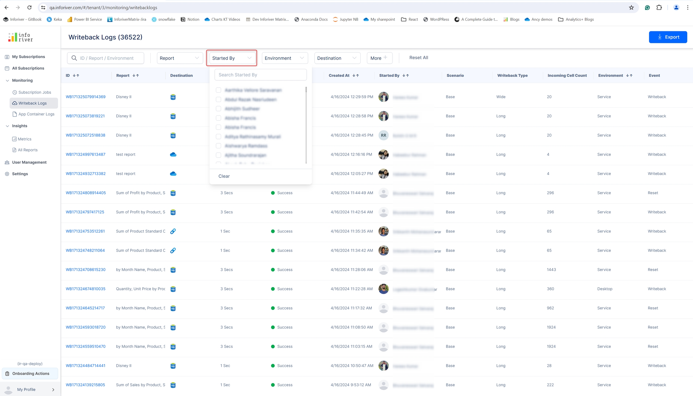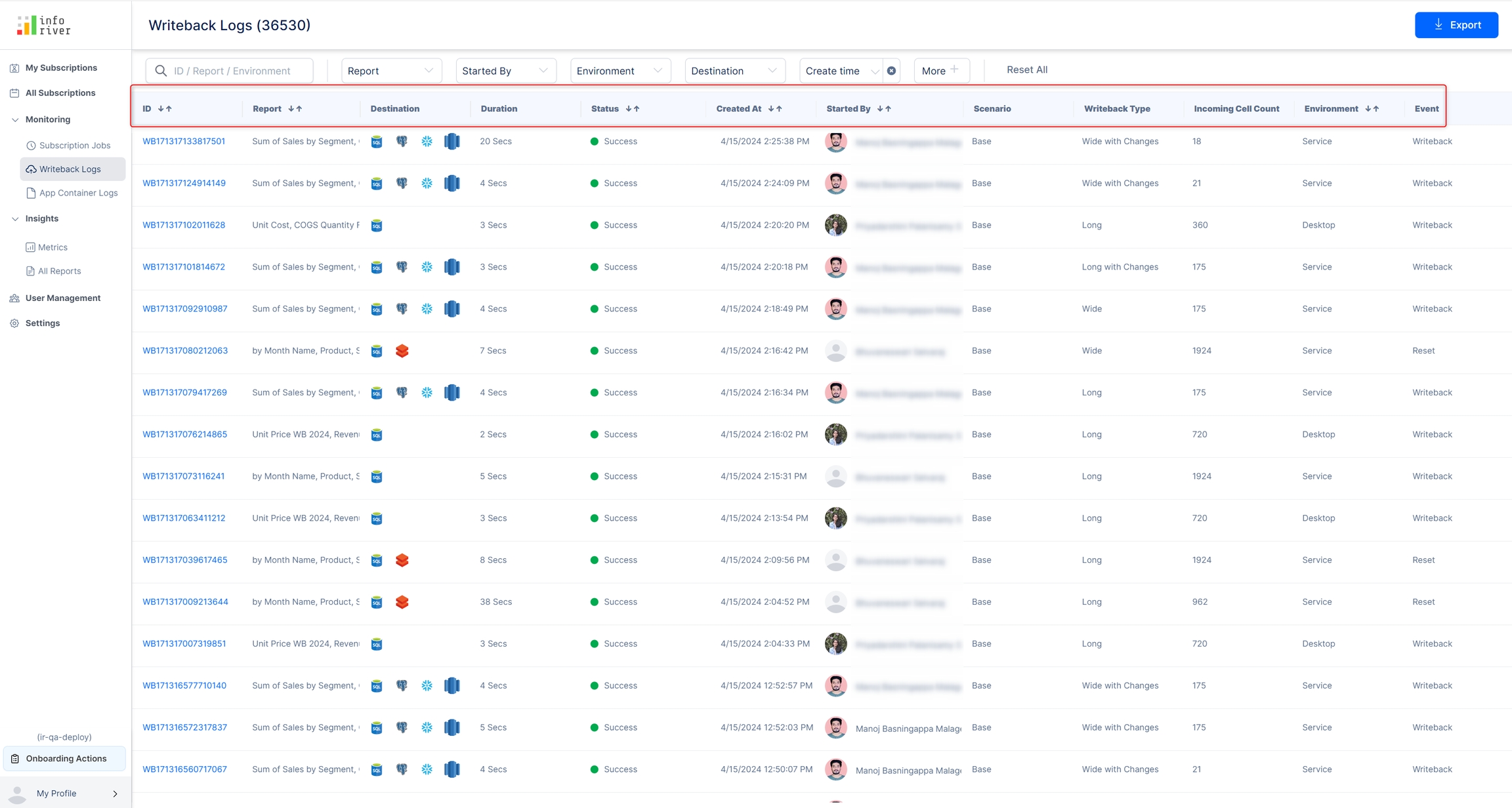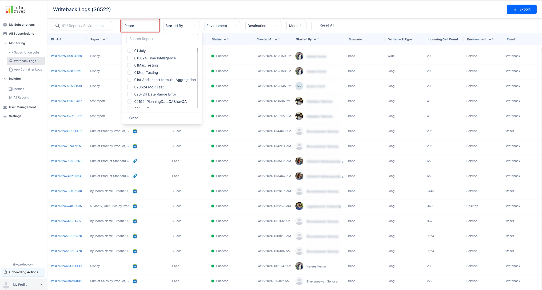In the search bar, users could search and filter writeback logs based on their ID, report, or environment.