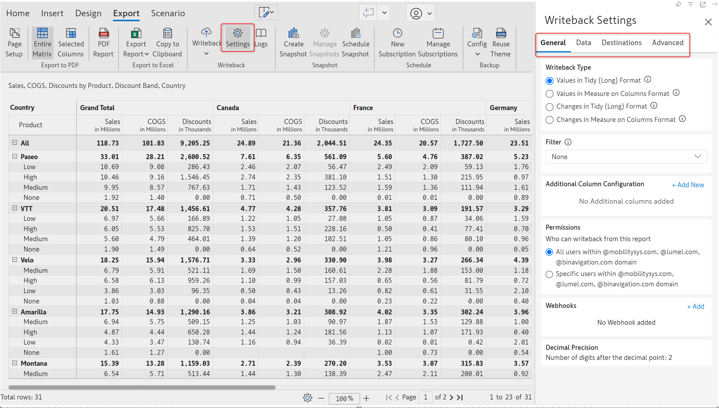 Clicking on the Settings icon under the Export ribbon will open up the **Writeback Settings** side pane.