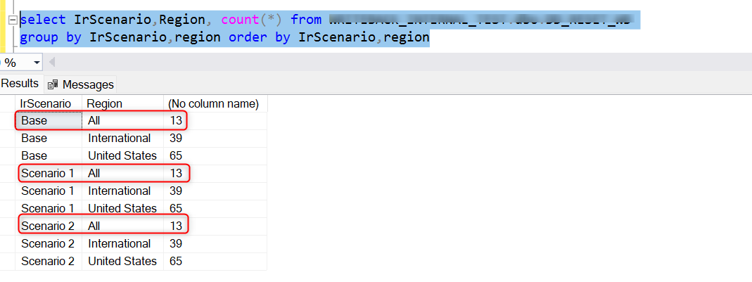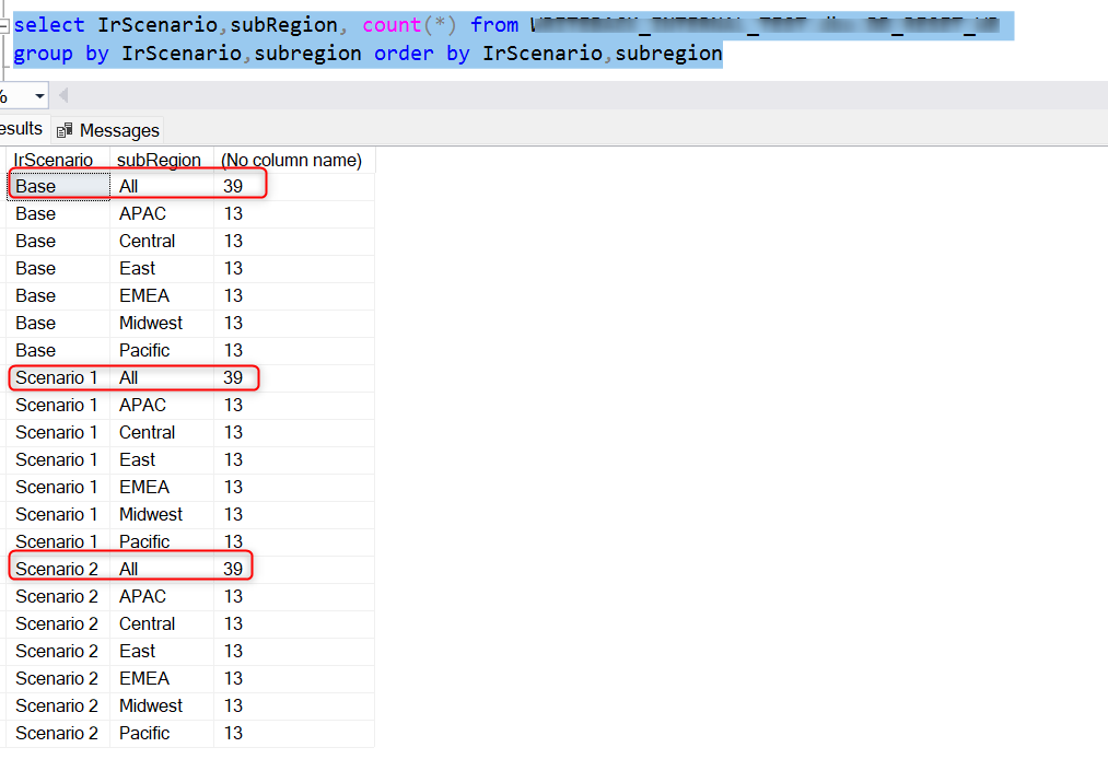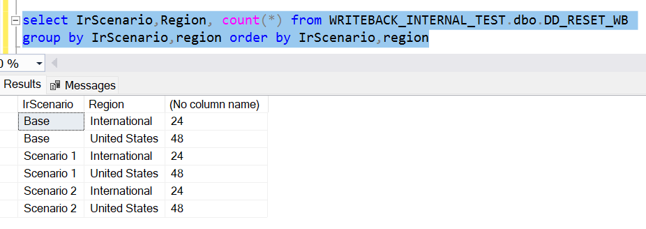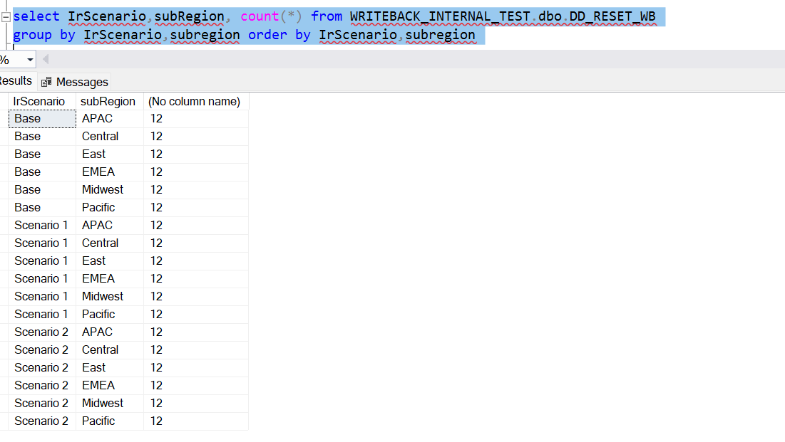 For demonstration purposes, consider a SQL server destination to which the base and scenario data have been written back. The count of data populated in the database, region-wise and subregion-wise, is as follows: