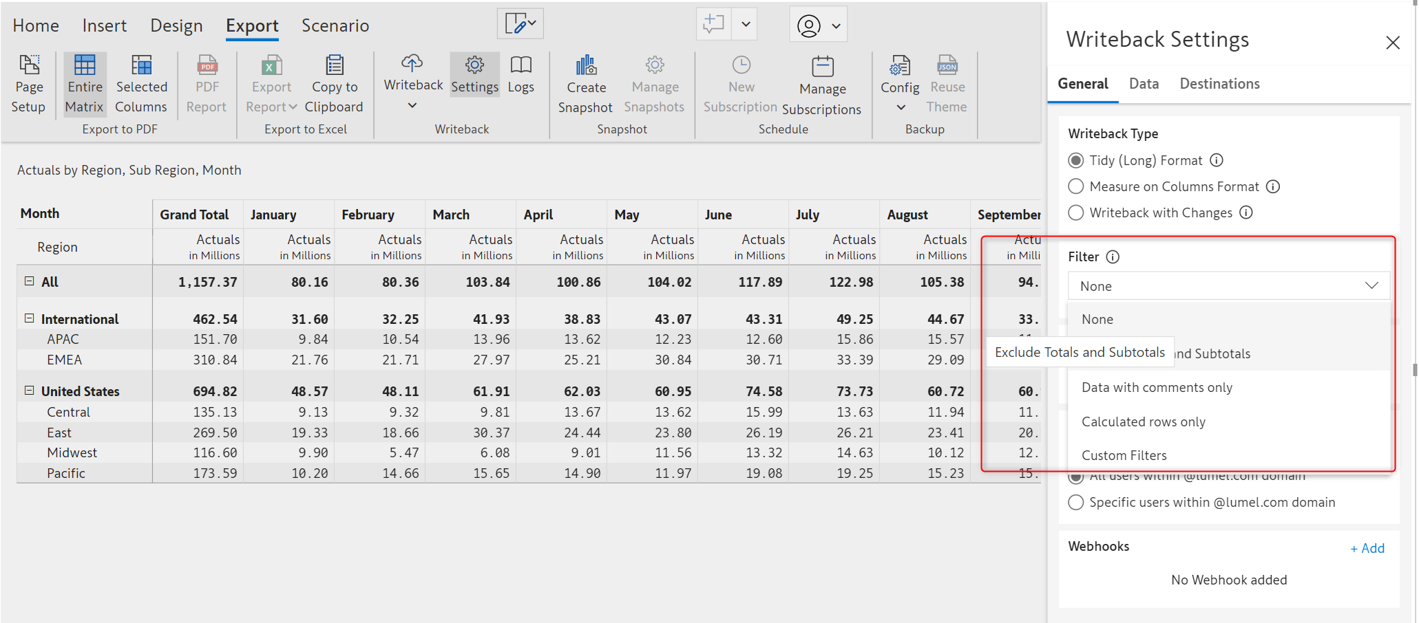 The filter in writeback settings is changed from "None" to "Exclude Totals and Subtotals":