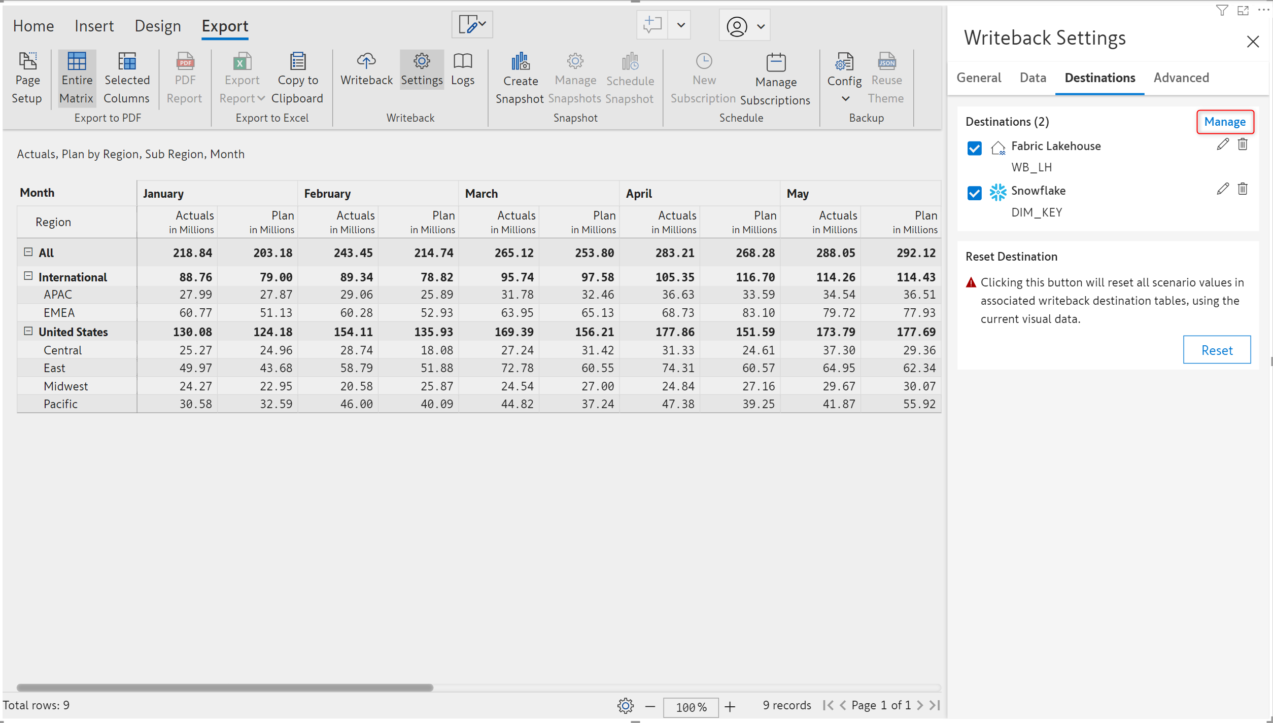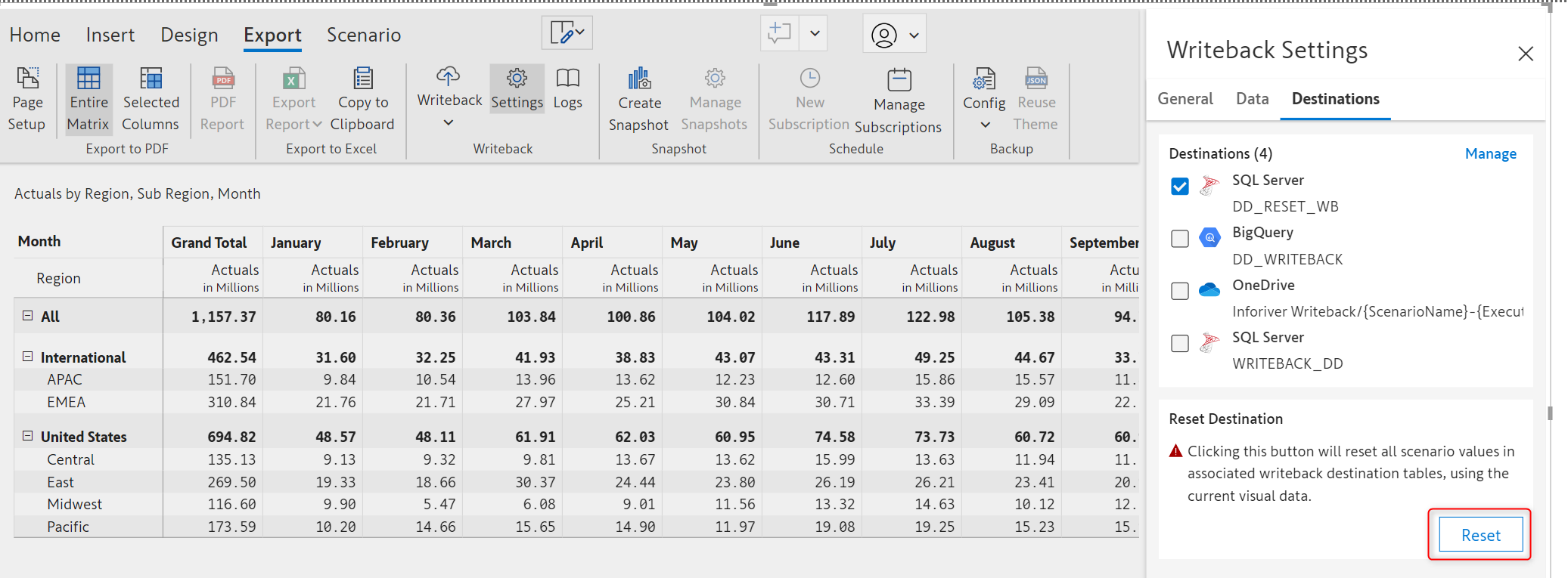 If the writeback filter has been changed, a reset is required to clean up the data existing in the destination(s) from previous writebacks. A reset will run a clean-up for both base and scenario data that has been written back to a destination.